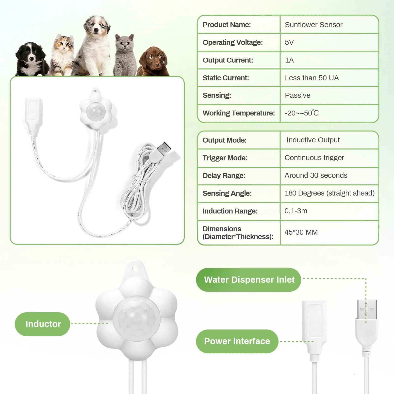Enhance your pet’s hydration with this white, flower-shaped automatic water dispenser featuring a motion sensor with an infrared detector. Crafted from durable, lightweight plastic, it measures approximately 1.77″ (45 mm) in height and 1.18″ (30 mm) in depth, with six rounded petals that create a friendly, aesthetic appeal. Powered by batteries (not included), it dispenses between 50g and 100g of water automatically when your pet approaches. Simple and practical, this universal accessory is ideal for cats and small pets, providing effortless water access and contributing to their well-being in a sleek, minimalist design.