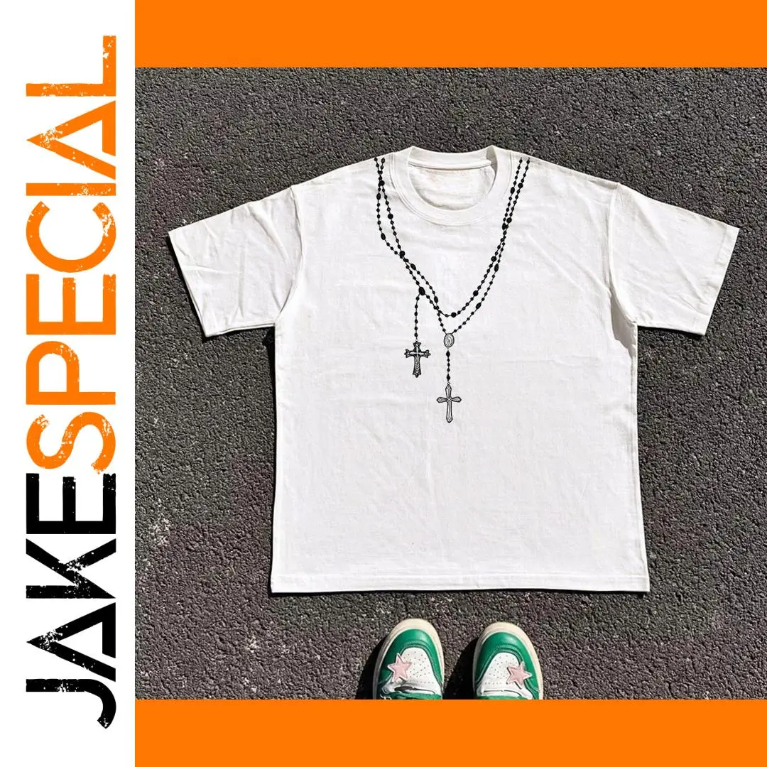 - Features a detailed graphic print of three layered necklaces with cross pendants, adding visual interest and modern style to your look.