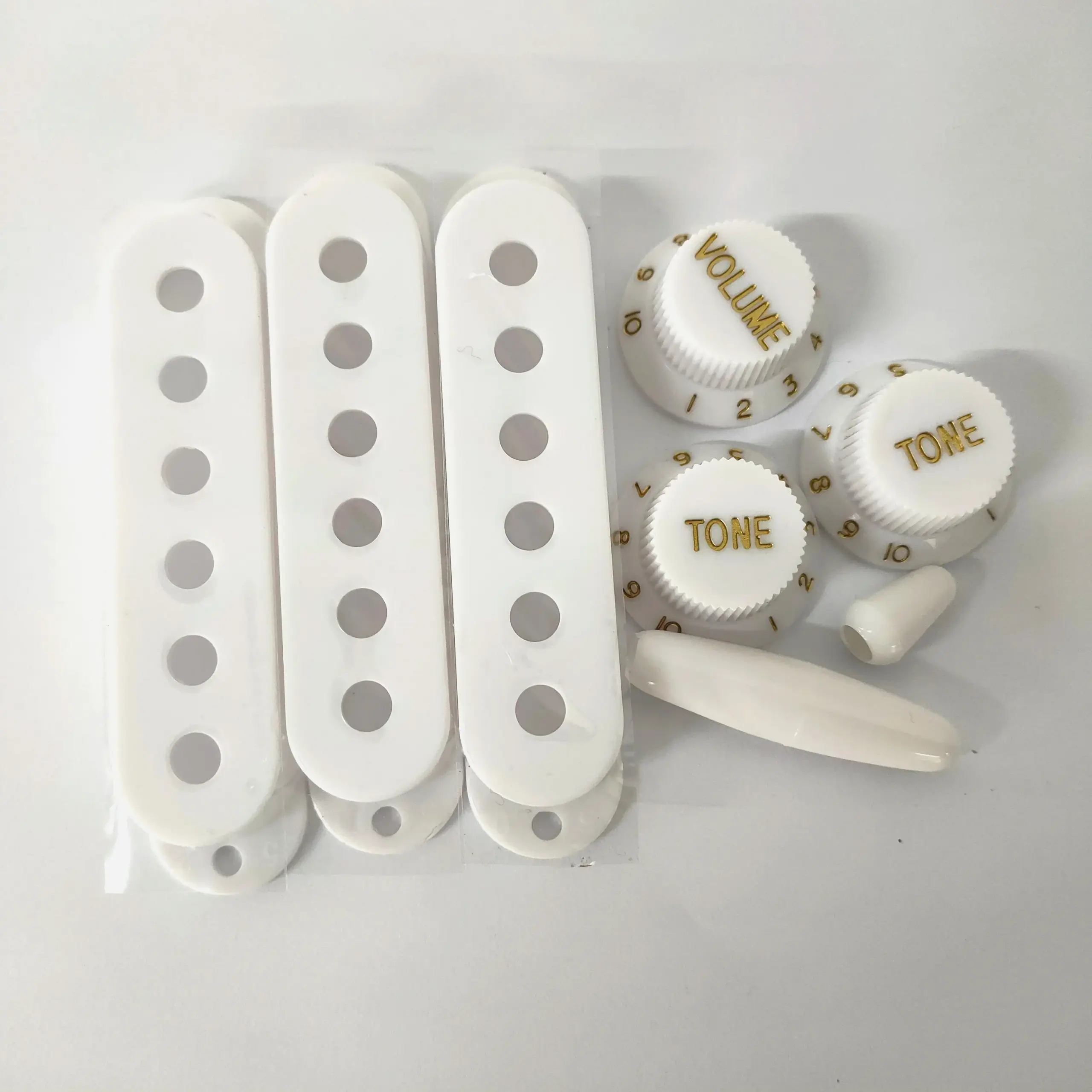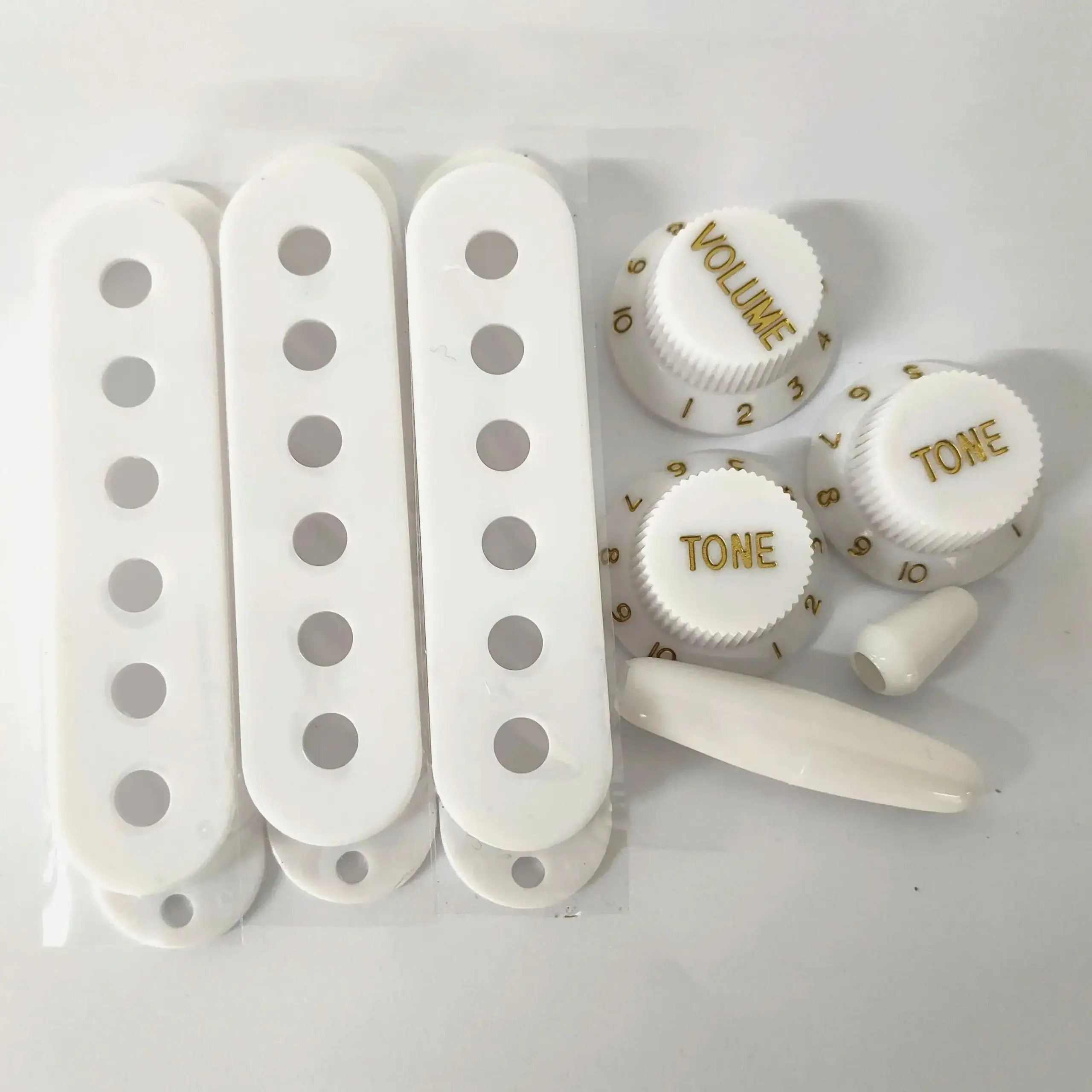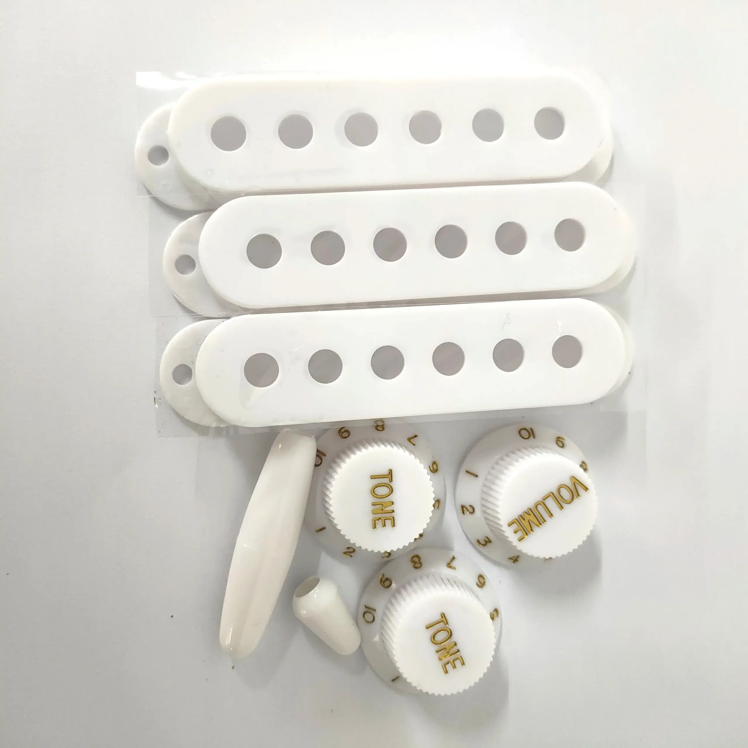 Transform your guitar with this sleek set of white plastic replacement parts, featuring two size options for pickup covers—Set 1 with 52mm/52mm/52mm covers and Set 2 with 50mm/50mm/52mm covers—crafted from durable, high-quality plastic with a refined finish. The kit includes three 2T1V control knobs, a switch tip, and a whammy bar tip with a 5mm internal diameter, all designed to seamlessly fit FD-style or similar guitars. Its minimalist, crisp appearance enhances your instrument’s aesthetic, offering a blend of functionality and modern style that elevates your guitar setup with expert precision and high-quality craftsmanship.