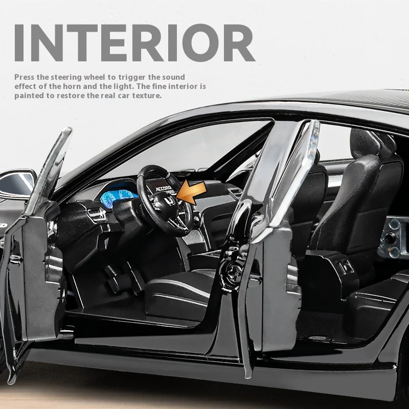 Experience the elegance and craftsmanship of this highly detailed 1:24 scale white Honda Accord diecast model. Perfectly crafted from durable high-quality metal alloy, it captures every nuance of the real vehicle with a sleek, glossy white finish. The model features intricately detailed silver rims with elaborate spoke patterns, a textured black sunroof, and precisely modeled side mirrors and door handles, enhancing its realism. The front headlamps, grille, and rear lights are meticulously designed for authenticity. With open doors revealing a detailed black interior, including seats, dashboard, and steering wheel, it provides an immersive display. Equipped with interactive lighting and sound functions powered by rechargeable or replaceable batteries, it brings the model to life with engine sounds and luminous effects. This collectible is perfect for display, gifting, or enhancing your collection.