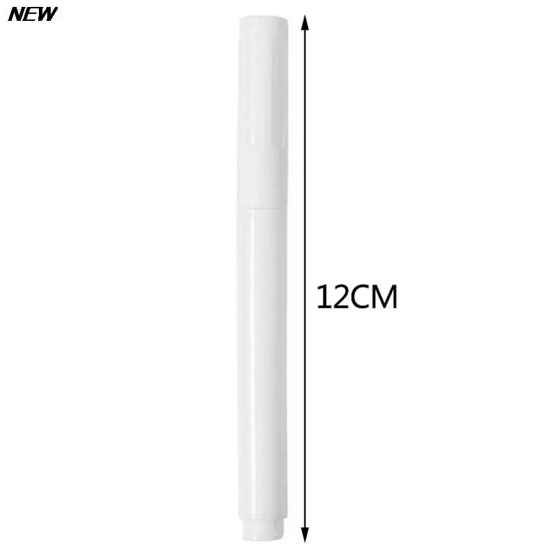 - Set of five white liquid chalk markers, each 12 cm long, crafted from eco-friendly PVC for safe use and durability. Their sleek cylindrical shape ensures a comfortable grip during use.