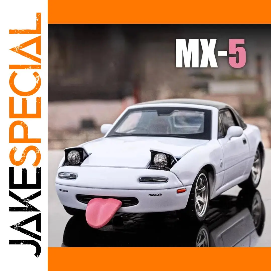 Imagine owning this beautifully crafted Mazda MX-5 die-cast toy car in a sleek white finish. Its realistic design captures the sporty essence of the original, enhanced by a whimsical pink tongue protruding from the front grille that adds playful charm. The car’s aerodynamic hood and smooth curves emulate true automotive elegance. With detailed headlights protected by lifted black covers and transparent windshield revealing an intricate interior, this collectible stands out. The metallic rims and textured tires add authenticity, while sound and light features bring excitement. Perfect for collectors or as a fun gift, this model radiates a blend of realism and playful character that will instantly captivate attention.