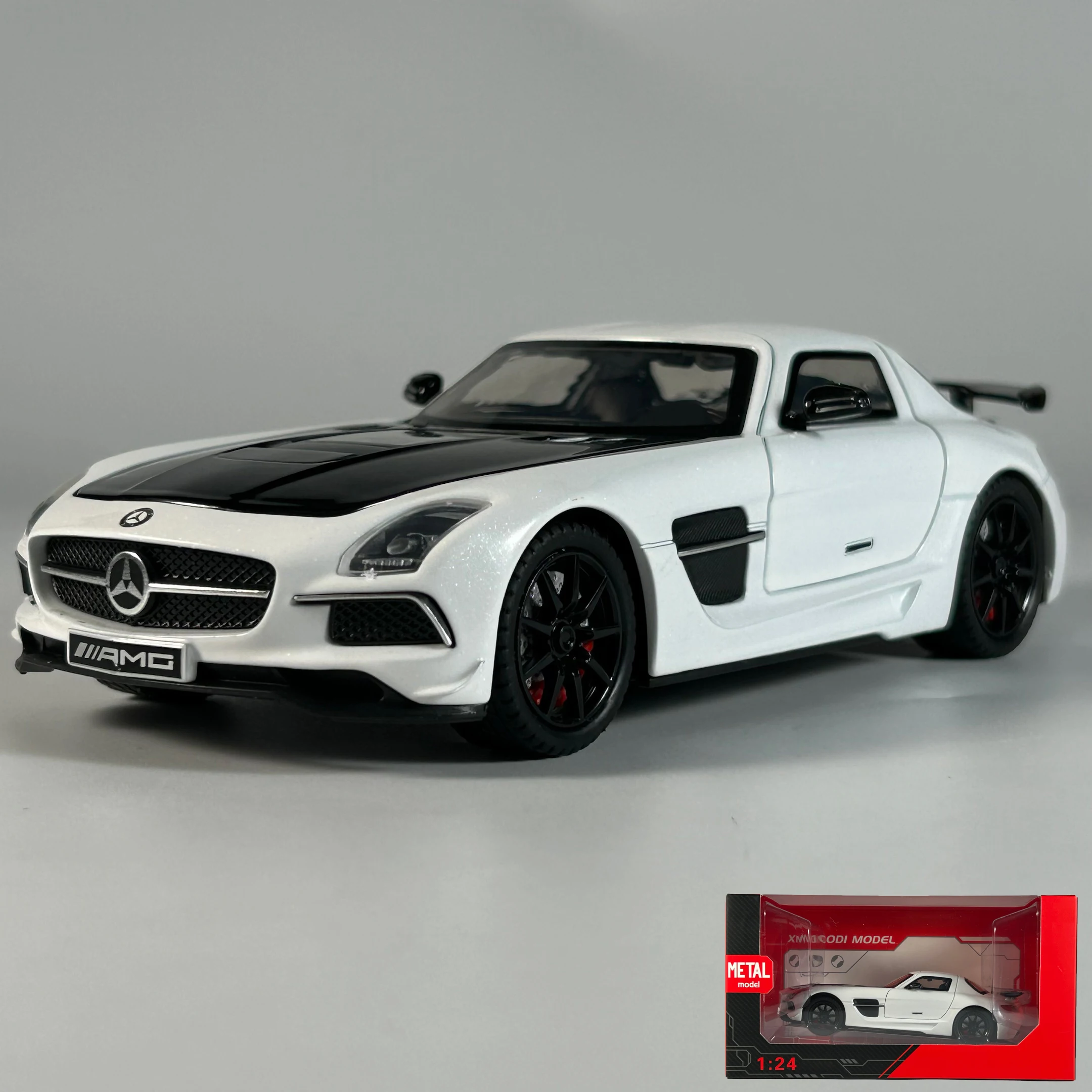 Step into the world of luxury with this highly detailed 1:24 scale Mercedes-Benz SLS diecast model. Crafted from premium metal alloy, it boasts a sleek, aerodynamic design that captures the essence of the real supercar. The glossy white finish is accentuated by striking black accents on the gull-wing doors, front vents, and side vents, creating a sophisticated contrast that highlights its sporty yet refined character. The carefully molded details include a prominent Mercedes-Benz grille with the iconic three-pointed star, intricately designed headlights, and realistic tire tread patterns on black alloy rims doped with red brake calipers, adding vibrant accents. The transparent engine hood reveals the engine underneath, enhancing its authenticity. With realistic proportions and craftsmanship, this model is perfect for display, collection, or as a high-end gift for automotive enthusiasts.