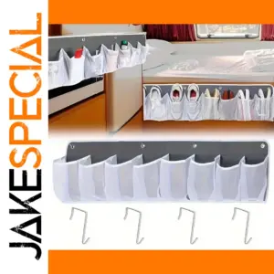 This white polypropylene mesh storage bag features a rectangular, elongated design with multiple breathable compartments, perfect for organizing small items in beds, RVs, or motorhomes. It includes four sturdy metallic hooks with a slight curve for secure hanging on rods or rails. Designed for durability and ease of use, it offers clear visibility, airflow, and a minimalist, modern aesthetic. Made without chemicals and used without electricity, this lightweight storage solution ensures practical organization. Its simple yet effective design helps keep your space tidy, making it an ideal choice for maximizing compact areas with quick access to stored essentials.