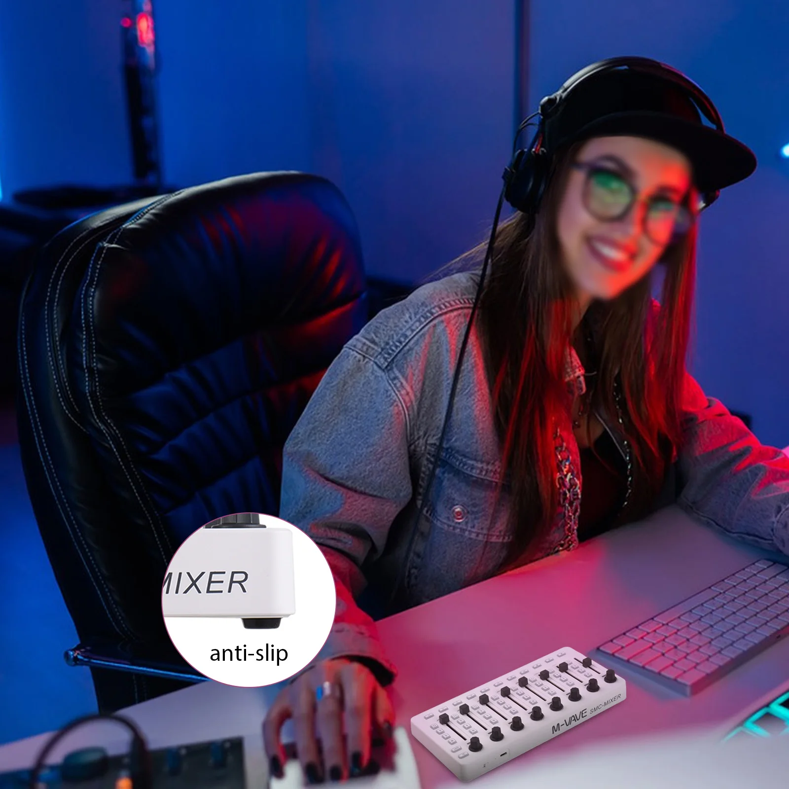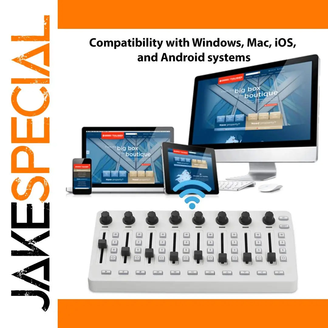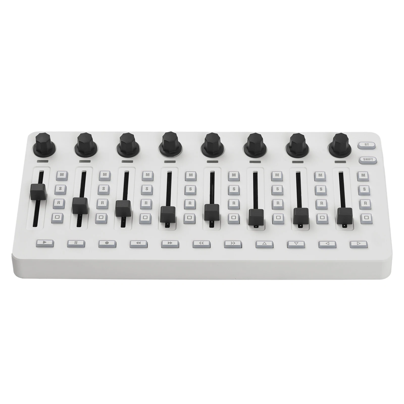 Enhance your music production with this sleek, white MIDI control and mixing console measuring 25.5 x 12 x 2.5 cm and weighing 425 grams. Features include 43 assignable control keys, 8 push buttons, and 8 rotary knobs with 360-degree rotation for precise adjustments. Supported by Bluetooth connection and compatible with Windows, Mac, iOS, and Android devices, it is powered by a 780mAh rechargeable battery or Type-C USB. Crafted from high-quality plastic, it offers durability, portability, and a modern minimalist design, making it an ideal tool for both studio and on-the-go music creation.