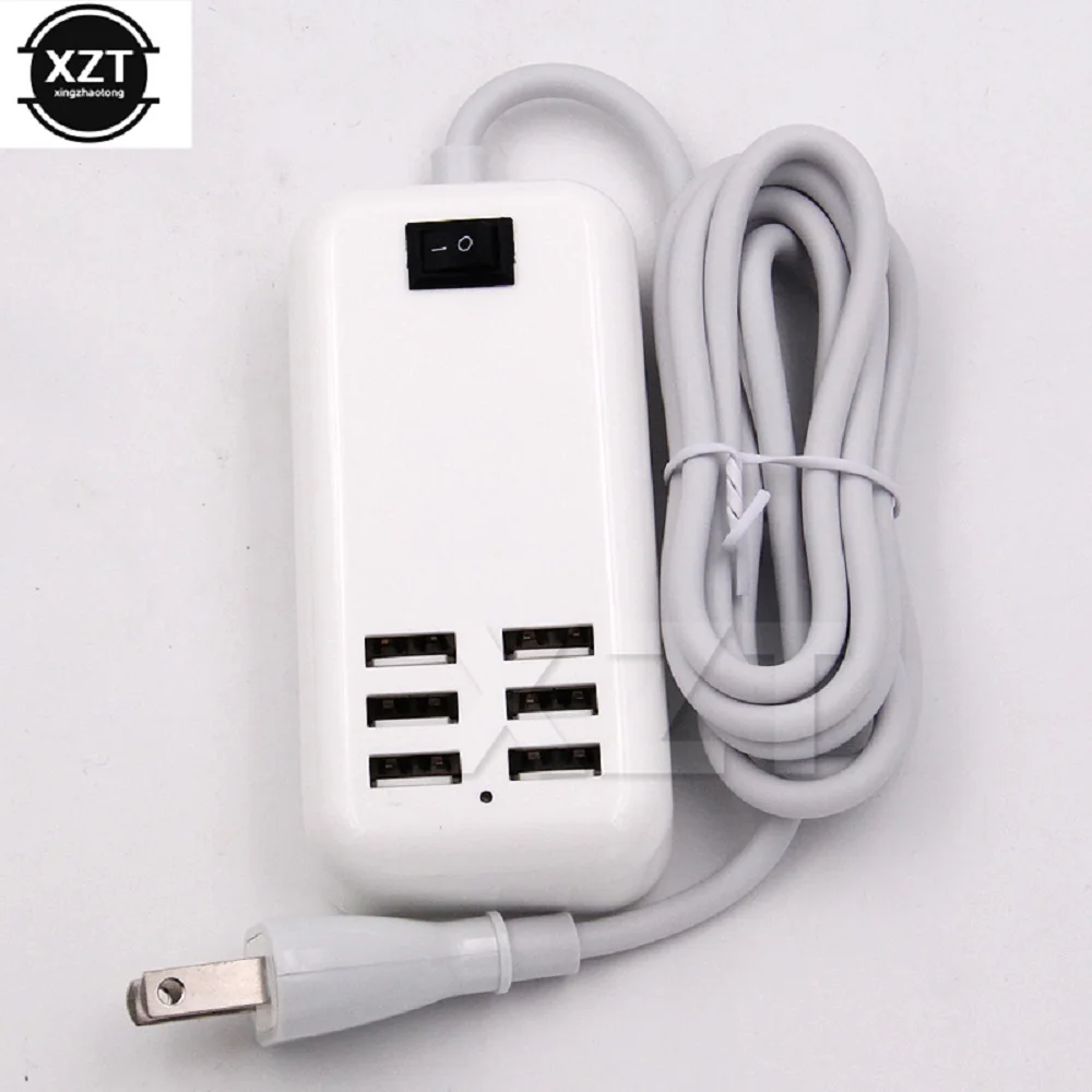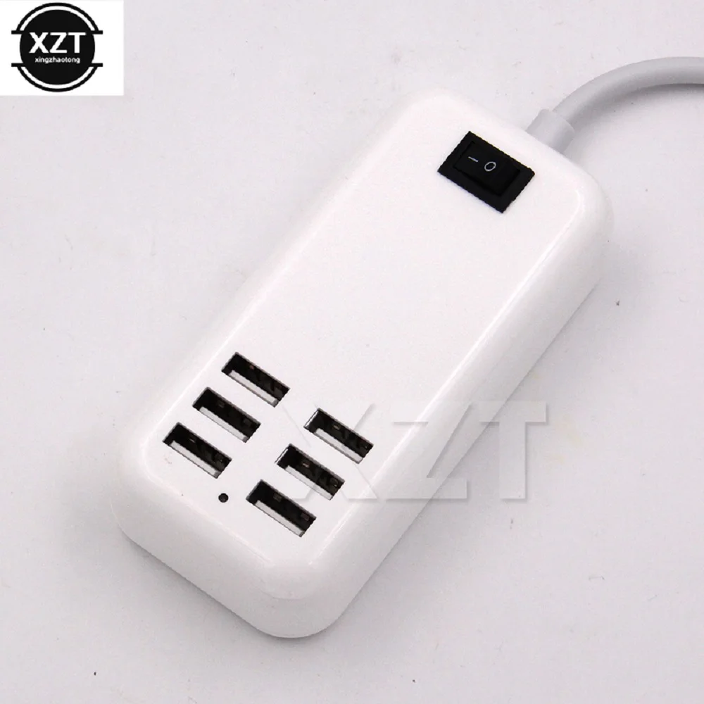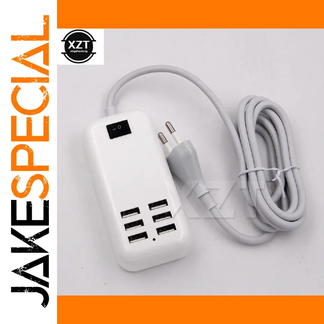 This sleek white multi-port USB charging station features six USB 2.0 ports with a total output of 5V, 6A, and supports simultaneous charging of up to four devices. Its modern rectangular design is lightweight and travel-friendly, with a detachable wall plug and approximately 1.5-meter cable length. Operating on an input of 100V-240V AC at 50/60Hz and delivering 10W of power, it features an on/off switch, LED indicators, and minimal off-load power consumption of ≤0.5W. Available with EU or US plug types, this versatile USB hub is perfect for those seeking efficient, simultaneous device charging in a compact, stylish package.