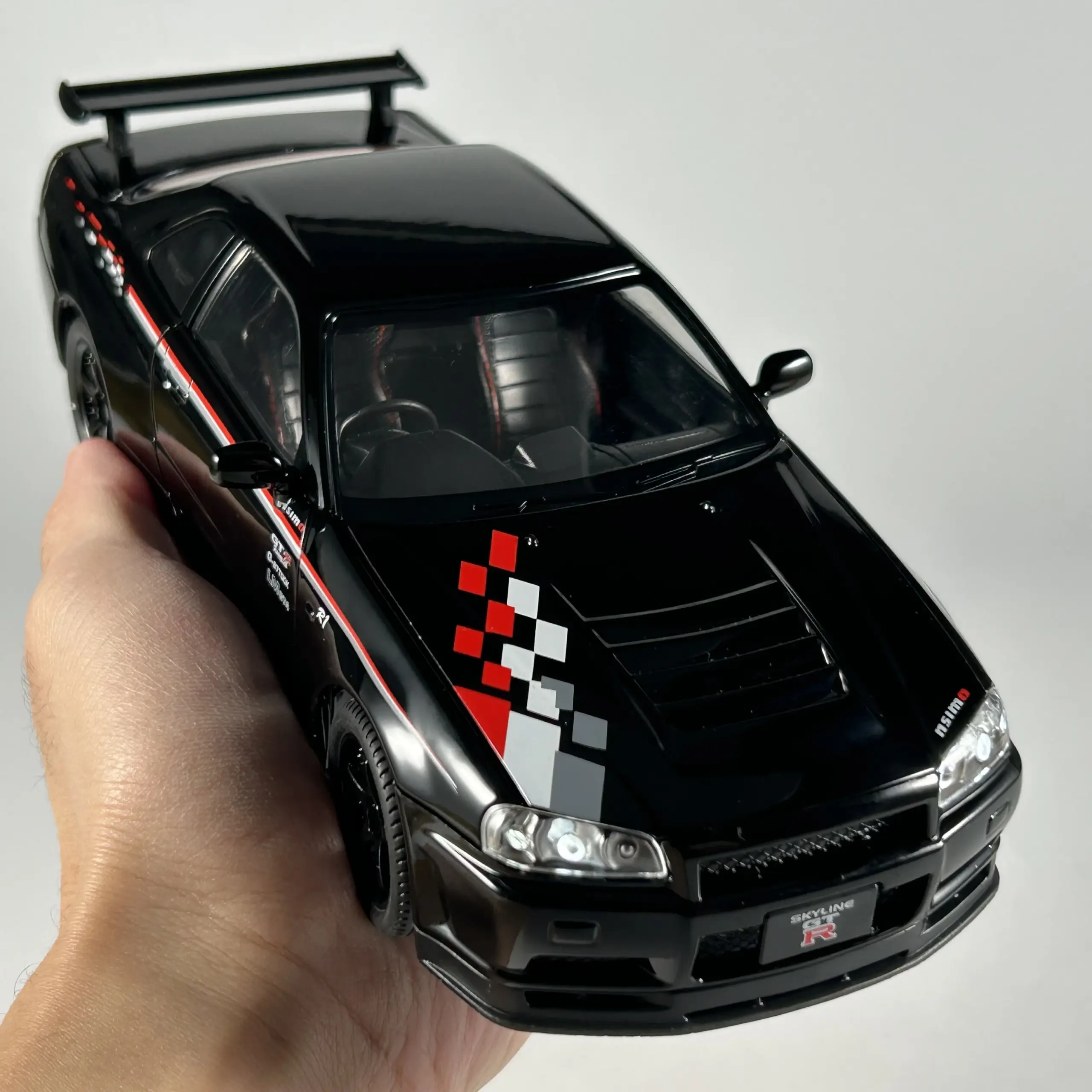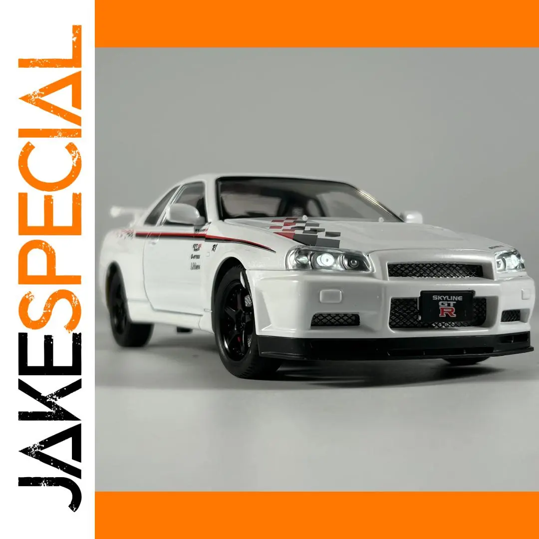 Enhance your collection with this meticulously crafted 1:24 scale diecast replica of the Nissan GTR R34 Skyline, featuring a sleek white finish with racing-inspired black and red checkered motifs on the hood and a striking red stripe along the sides. Crafted from durable metal, the model boasts intricate details such as textured black grille, clear headlights with inner detailing, sculpted side mirrors, and multi-spoke black wheels with detailed tread patterns. The prominent rear wing spoiler and realistically molded side panels add to its dynamic appearance. Suitable for collectors aged 14 and above, this high-quality home decor piece combines authenticity and style, making it an impressive desktop ornament or display item.