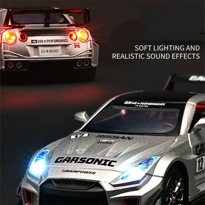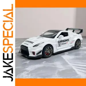 Experience the thrill of high-performance racing with this highly detailed 1:32 scale diecast alloy model of the Nissan Skyline GTR R35. Meticulously crafted from metal and plastic, it features realistic design elements like sculpted vents, sleek contours, and a low, wide stance that captures the essence of the original sports car. Available in eye-catching white, this model boasts bold racing decals, a prominent rear wing, and detailed rims with textured tires, giving it an authentic, dynamic appearance. The integrated sound and light functions add to its realism, making it perfect for display or play. Designed for collectors and enthusiasts, this model enhances any space with its exquisite craftsmanship and sporty aesthetic.