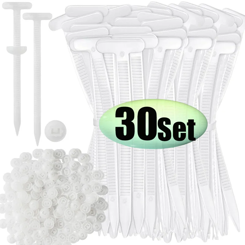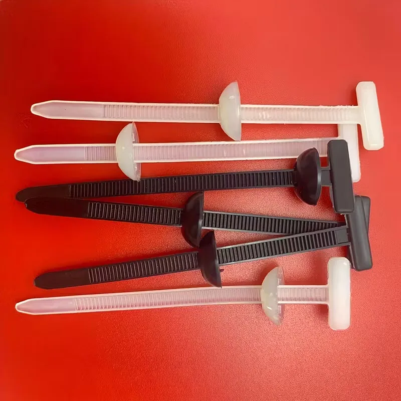 - Technical specifications include high-strength plastic material, T-shaped head with a small threading hole, grooved grip surface, and a secure, self-locking locking mechanism.