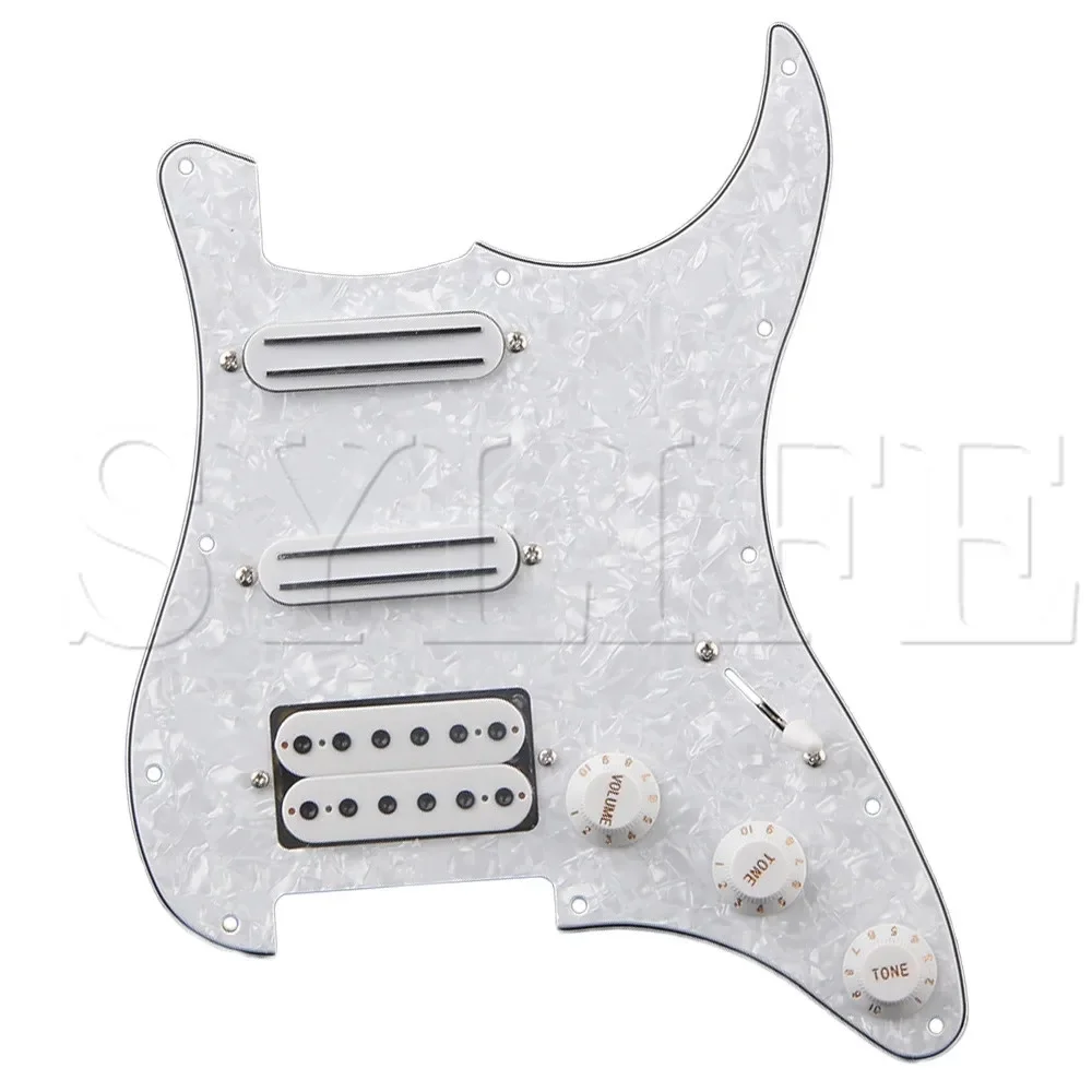Transform your electric guitar into a striking masterpiece with this versatile loaded pickguard. Crafted from high-quality three-ply white pearl material, it offers a luminous iridescent finish that catches the light beautifully. The sleek, contoured design echoes classic Stratocaster styling, providing an elegant aesthetic while maintaining comfort. The pickguard houses three precisely mounted pickups—two single-coil and one humbucker—giving you a wide range of tonal options. The included control knobs are vintage-inspired with textured grips, allowing smooth adjustments. Equipped with a 5-way toggle switch, this pickguard makes switching between pickup configurations effortless. Perfectly designed for 11-hole electric guitars, this set is an easy upgrade for enthusiasts seeking both style and functionality.