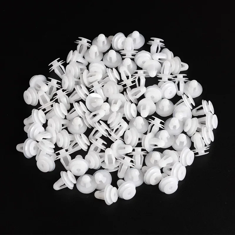 - This cleverly designed white plastic clip features a 9mm hole diameter, fitting comfortably into pre-drilled holes for quick, secure fastening of automotive panels.