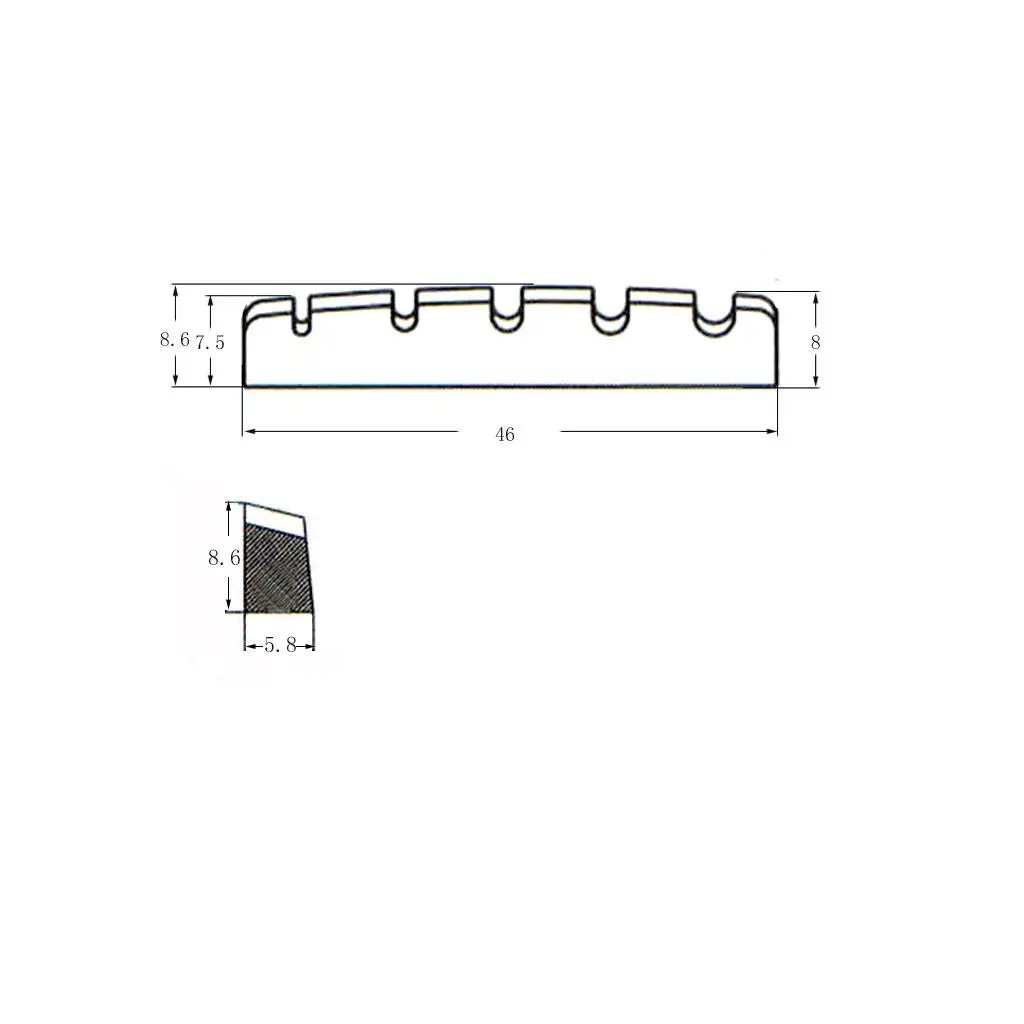 - Technical specifications include the dimensions 46 mm in length, 8.6 mm in width, and 5.8 mm in height, with a smooth matte finish for minimal friction and maximum string vibration transfer.