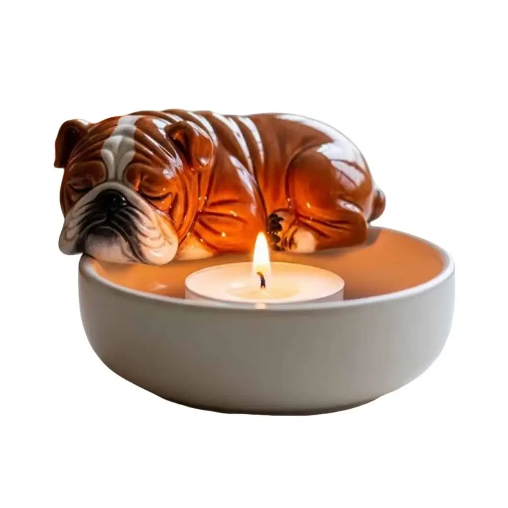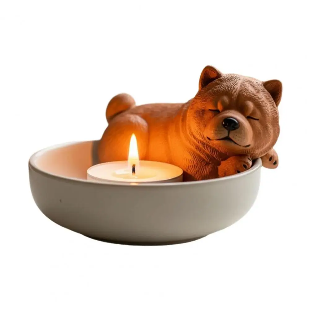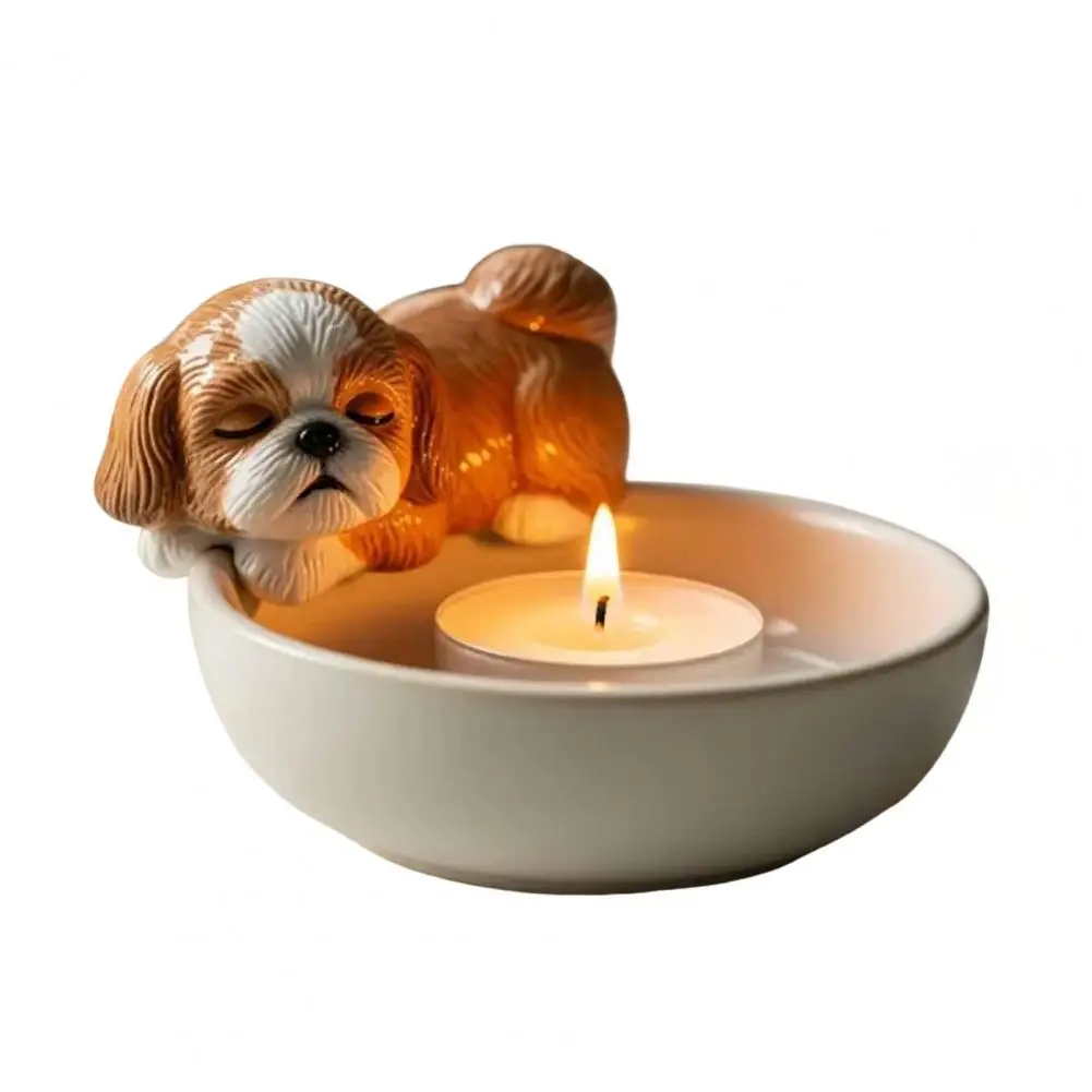 Transform your space into a cozy, inviting environment with this adorable white puppy candle holder. Handcrafted with intricate cartoon-style details, it captures a peaceful sleeping puppy's charm perfectly. Made of durable resin with a smooth matte finish, it measures approximately 7 cm in diameter, making it a versatile accent for shelves, desks, or bedside tables. Its compact size and whimsical design bring a playful yet elegant touch to any decor style, whether modern or rustic. When you light a tea light inside, it emits a gentle, warm glow that highlights the puppy’s endearing features and creates a relaxing ambiance. This piece is ideal for pet lovers or anyone seeking a heartfelt decorative item.