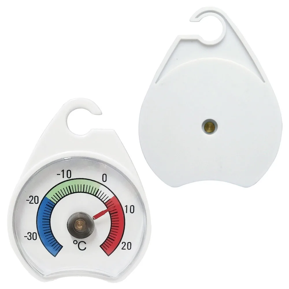This sleek, white, teardrop-shaped refrigerator thermometer combines modern design with precise temperature monitoring. Made from durable ABS plastic, it features a circular dial encased in clear plastic, displaying a vibrant, color-coded temperature scale ranging from -30°C to 20°C. The blue section indicates freezer temperatures, green for optimal refrigeration, and red for warmer readings. Its simple needle points accurately to current temperatures, with the sensing element subtly visible through a small hole at the back. Equipped with a convenient vertical hook, this thermometer is easy to hang inside your refrigerator or freezer. Its compact size (6.5 cm height x 5.4 cm width) makes it unobtrusive yet highly functional, ensuring your food stays fresh and safe across all storage environments.