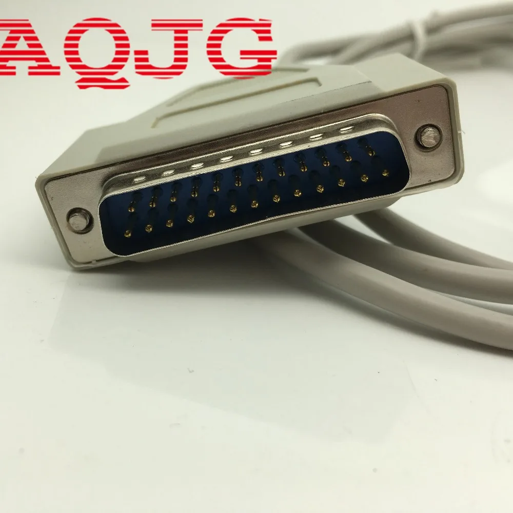 - The female DB25 connector is housed similarly, with a solid metallic shell, precisely arranged pin holes, textured grip for handling, and securing screws.