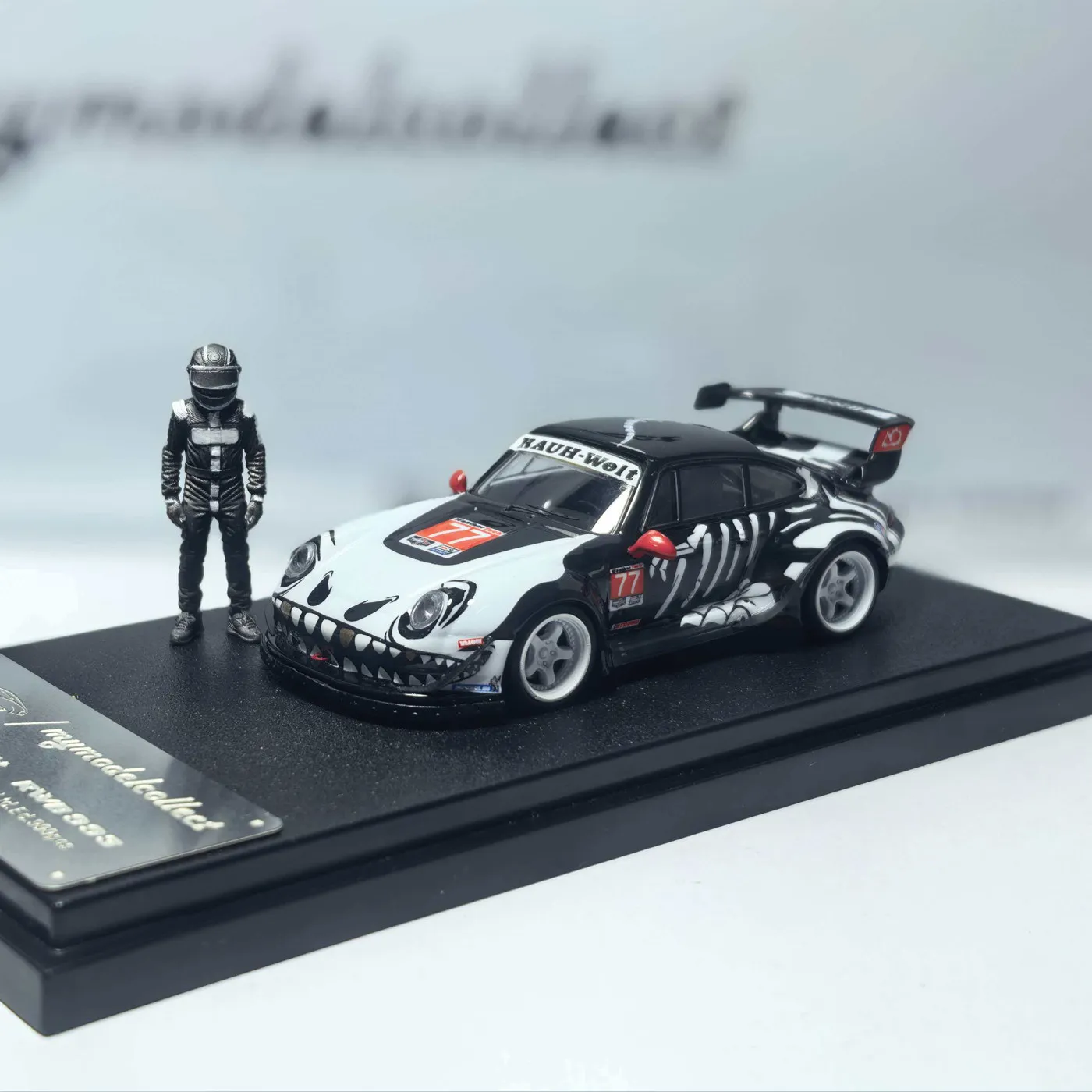 Experience the allure of this meticulously crafted 1:64 scale model of a Porsche RWB 964, designed for passionate collectors and enthusiasts. Measuring approximately 7 cm in length, this model showcases a striking black body with intricate white skeleton-like patterns covering the hood, sides, and rear, creating a bold visual contrast. The sleek, aerodynamic silhouette captures the iconic Porsche 911 design, further emphasized by detailed headlights, a large rear wing spoiler, and white accents. The gold rims add a refined touch, while the open-spoke gray wheels enhance its racing-inspired aesthetic. Perfect for display in a collection or as an eye-catching decorative piece, this model represents precision craftsmanship and a vivid attention to detail, appealing to fans of high-performance sports cars.