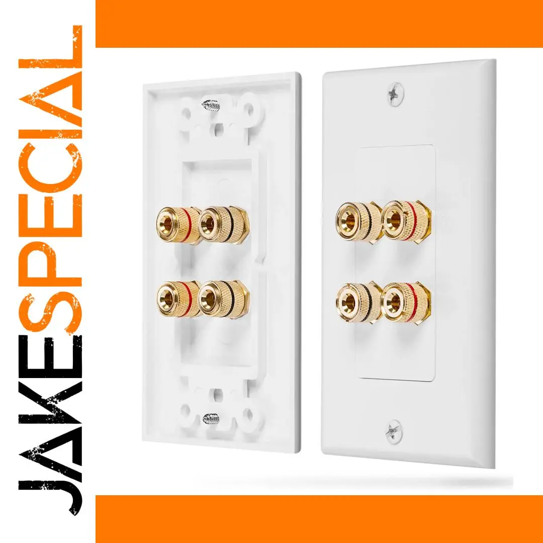 Enhance your home theater with this sleek white speaker wall plate measuring 75 x 115 x 15 mm, featuring corrosion-resistant gold-plated connectors for reliable audio signal transfer. Compatible with banana plugs, spades, or bare wire, it offers matching front and back connectors that require no soldering, ensuring quick and secure installation. The plate includes two banana female jacks and two female (jack) connectors, with a sophisticated white and gold color scheme that adds a touch of elegance to your setup. Constructed from durable PC and metal materials, this wall plate provides a neat, professional look while efficiently safeguarding speaker cables for optimal performance.