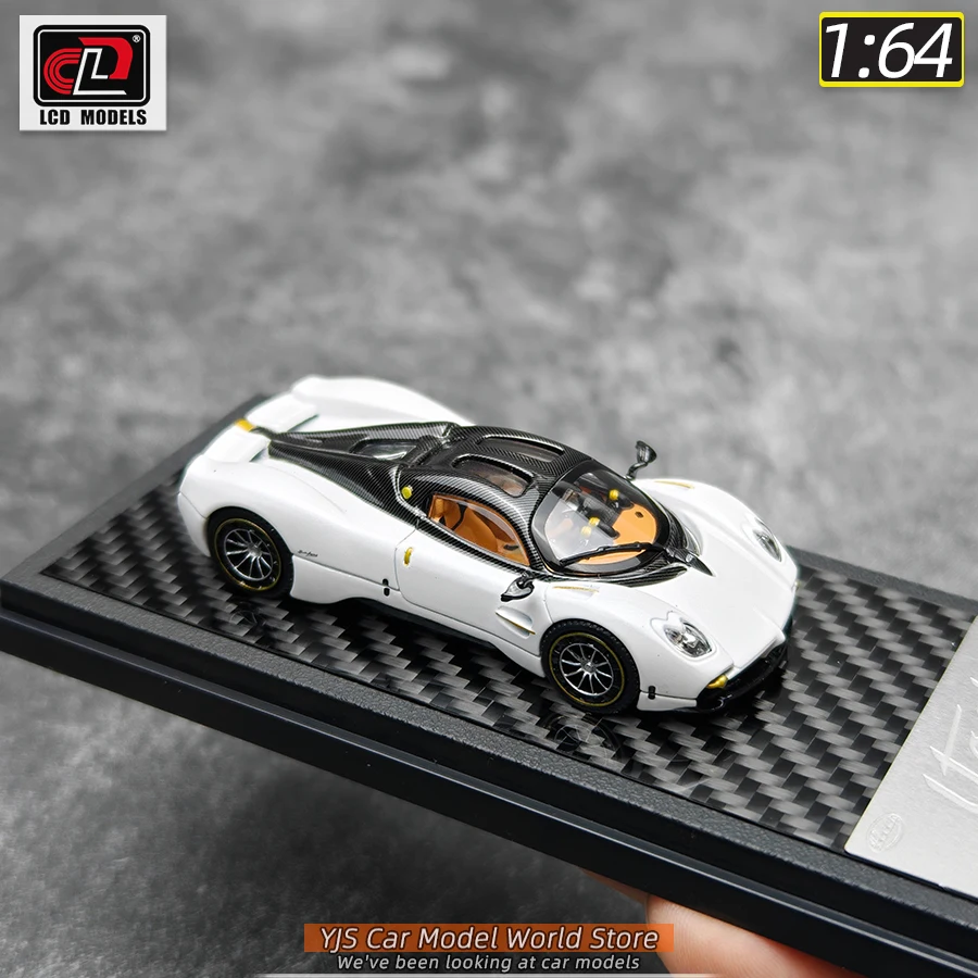 Discover the sleek elegance of this high-quality diecast model car, meticulously crafted for collectors and enthusiasts alike. Designed at a 1:64 scale, it features a durable metal body with a stunning white finish, accented by a striking black carbon fiber pattern on the roof and driver's side. The transparent canopy-style cockpit reveals a detailed interior in tan or light brown, adding realism and depth. Small black supports hold the side mirrors, complementing the refined finish. The headlights are painted silver with clear lenses, and the front nose is smoothly rounded, tapering into an aerodynamic spoiler at the rear. Black wheels with silver accents and textured rubber tires complete the sporty, high-performance aesthetic. Small yellow details near the front and rear enhance its dynamic look.