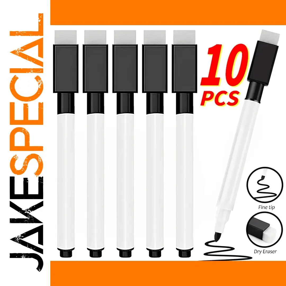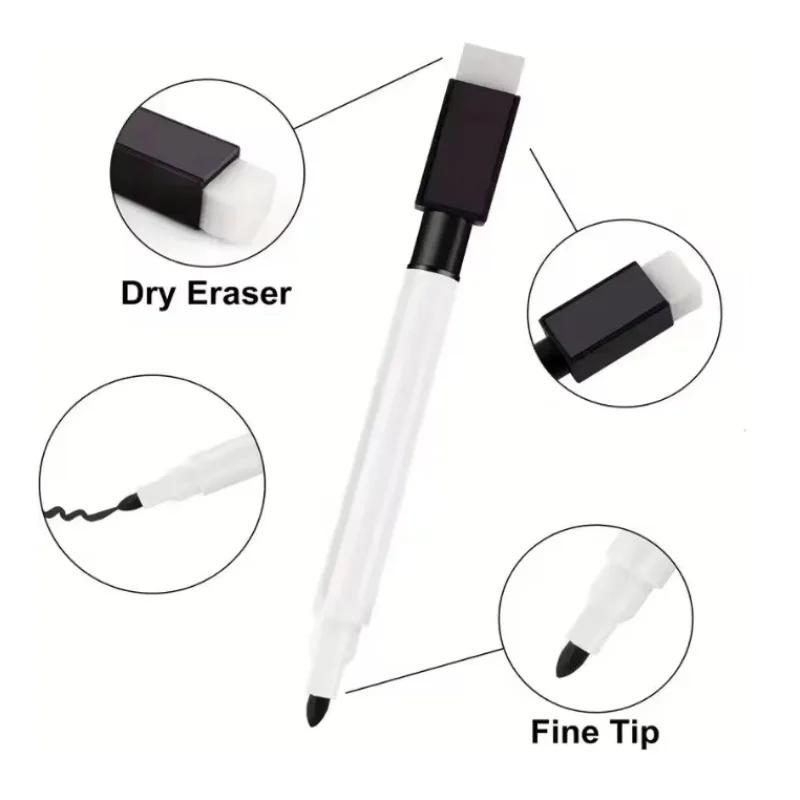 - Technical specifications: 0.5mm fiber tip, 11.5cm length, plastic casing, smudge-proof ink, built-in eraser included, suited for dry erase use on multiple whiteboard sizes.