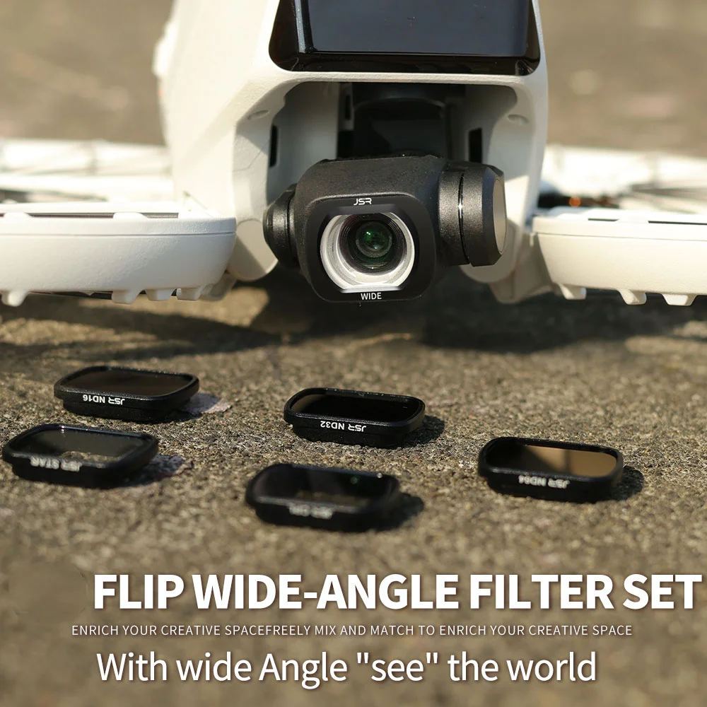 Enhance your DJI Flip drone photography with this premium set of wide-angle filters, including ND32, ND64, ND128, and a 1/4 Black Mist filter. Crafted with high-quality optical glass and a sleek black frame, these filters deliver professional results by controlling exposure and reducing glare across a range of lighting conditions. The purple-tinted ND filters offer high light reduction for vivid, contrast-rich images, while the Black Mist filter softens highlights for a dreamy, diffused look. Designed for easy Snug fit, these filters are perfect for capturing stunning footage effortlessly. Their minimalist and durable design ensures longevity, reliability, and style, making this set an essential accessory for drone enthusiasts seeking superior image quality and creative flexibility.