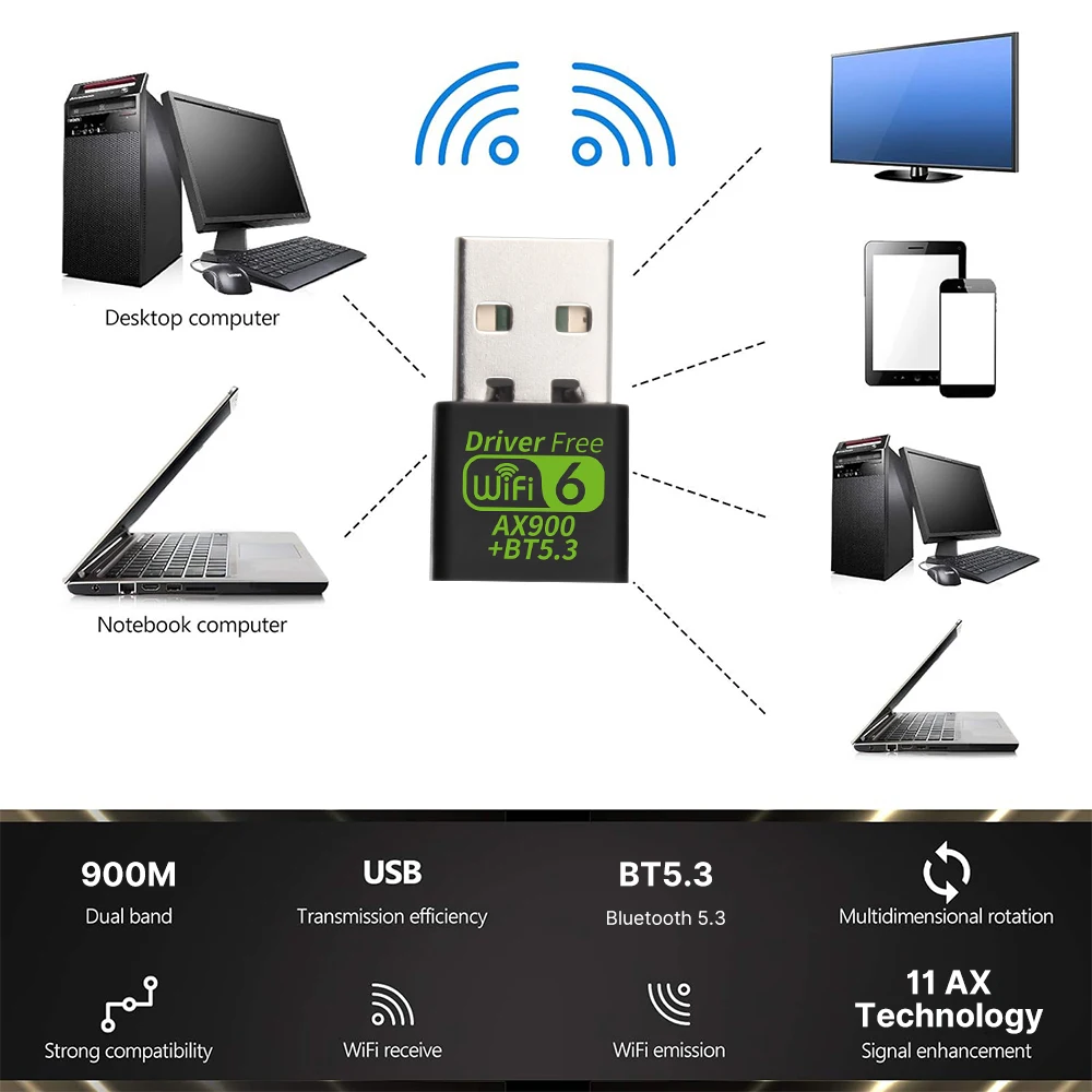 Imagine effortlessly connecting to the internet and enjoying your favorite online activities without interruptions. The WiFi 6 AX900 BT5.3 USB WiFi Adapter is designed to meet your connectivity needs with modern technology and stylish form. Elevate your internet usage experience and embrace faster speeds and robust connections. Don't wait any longer; enhance your online lifestyle with this innovative adapter!