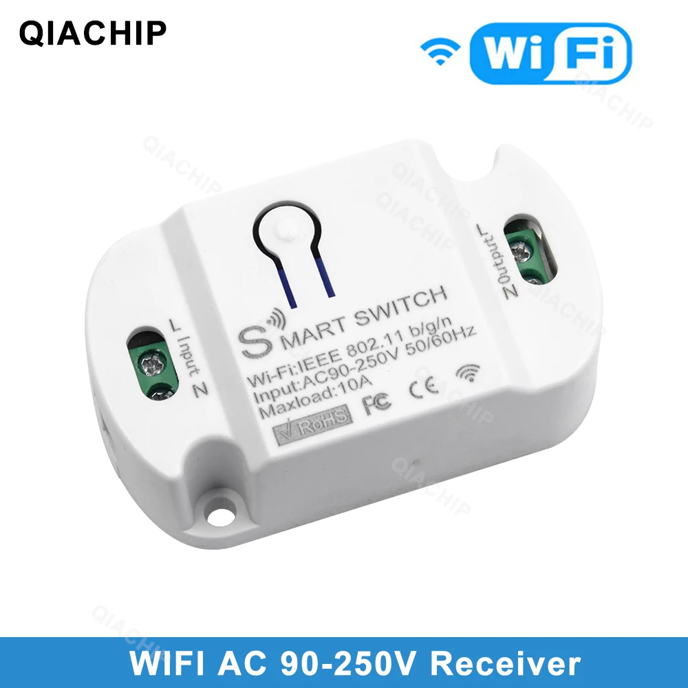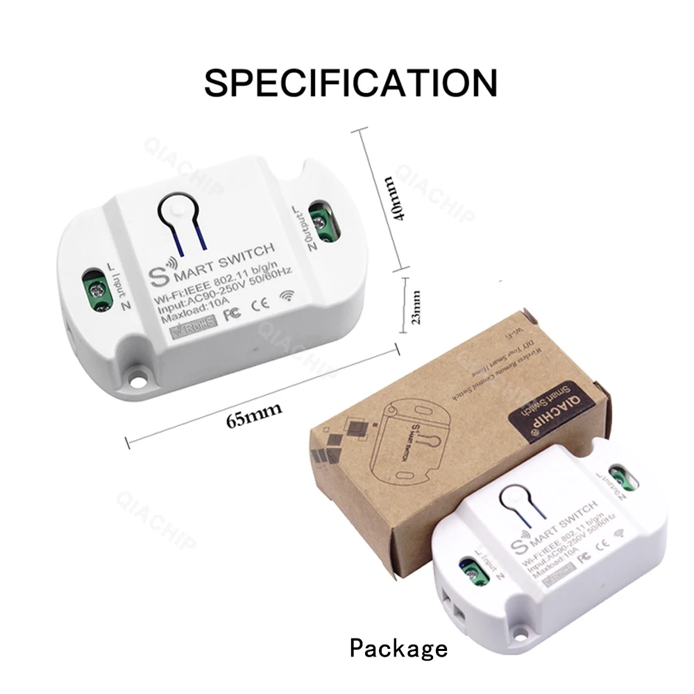 Experience seamless control of your electrical appliances with this sleek, compact WiFi mini smart switch. Measuring just 65mm by 23mm by 40mm, it effortlessly blends into any modern environment. Its clean white exterior with a discreet control button and LED indicator creates a minimalist aesthetic. Designed for easy installation, it features green terminal screw connectors for straightforward wiring. With advanced Wi-Fi (802.11b/g/n at 2.4GHz) and RF (433MHz) communication, it allows remote operation via smartphone through the Smart Life app for both Android and iOS devices. This device supports 1-way control and integrates perfectly with Alexa, Google Assistant, and Tuya smart home ecosystems for voice control and automation, making your smart home setup more intuitive and flexible.