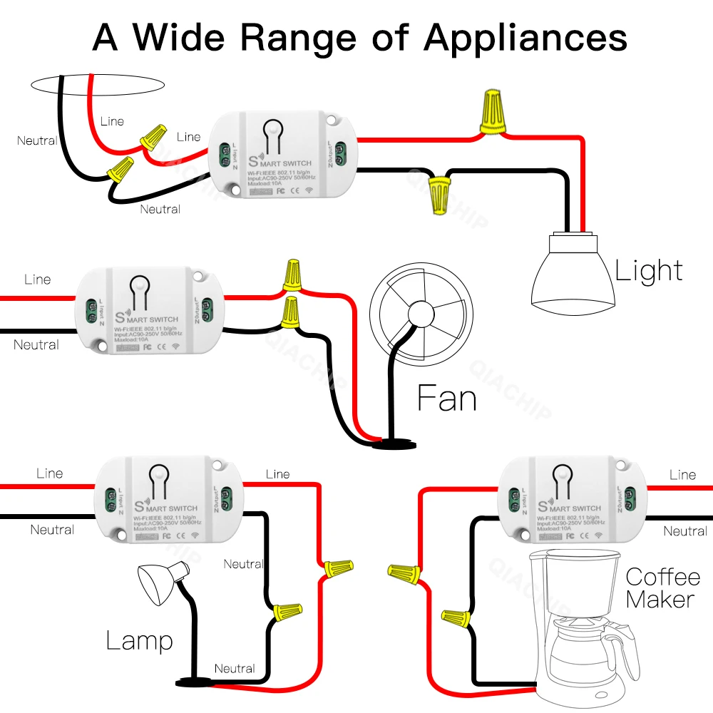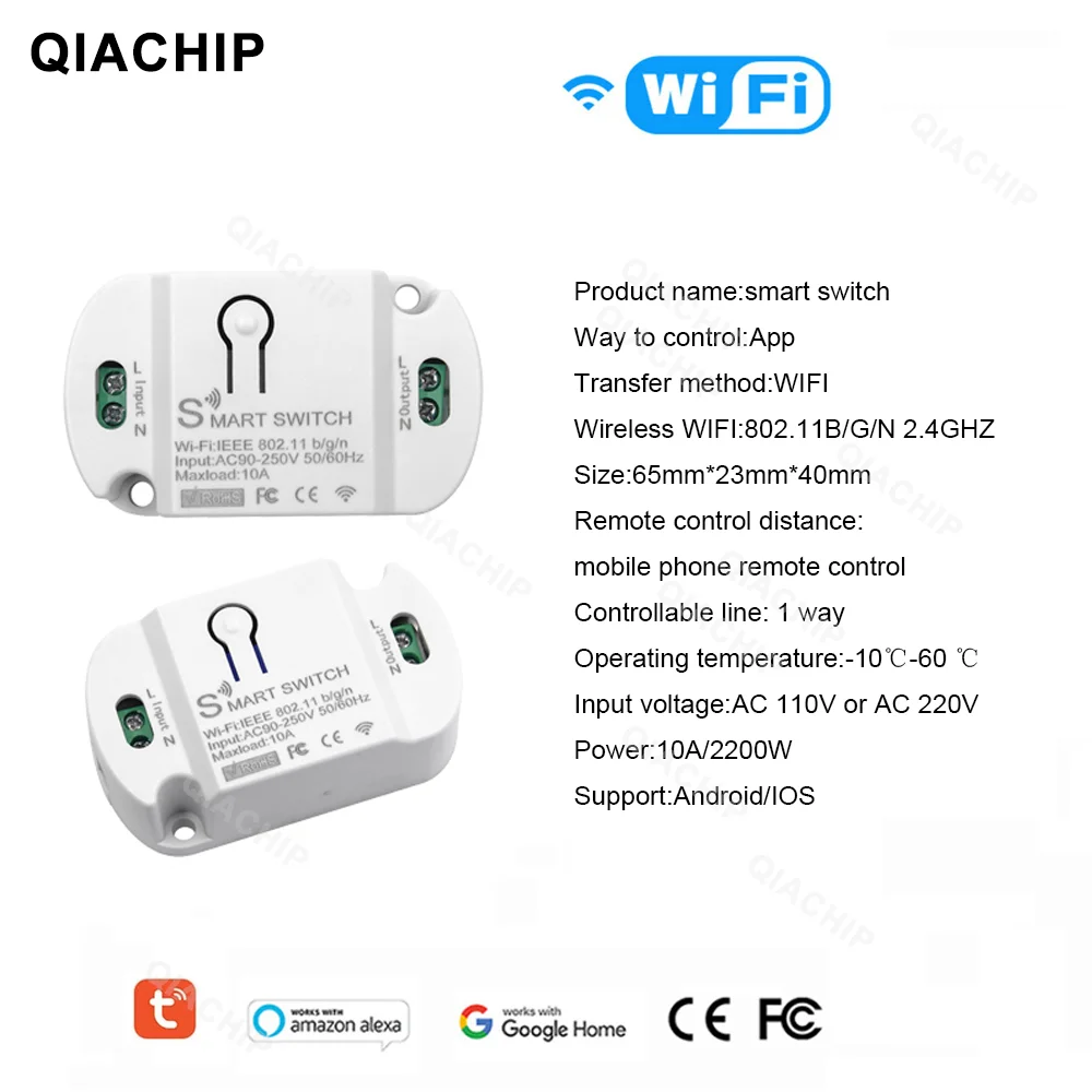 Experience seamless smart home control with this WiFi smart switch, measuring 65mm x 23mm x 40mm and compatible with appliances operating at AC 90V-250V and 50/60Hz. supporting a maximum current of 10A/16A, it offers a resistive and incandescent load power of 2200W at 220V AC, along with handling inductive loads up to 500W, capacitive loads up to 200W, and energy-saving lamps up to 300W. Equipped with 2.4GHz Wi-Fi (802.11b/g/n) and compatible with Android and iOS apps, it integrates effortlessly with Alexa and Google Assistant for voice control. Its minimalist design features a reset button for quick reconfiguration, enabling remote control and automation from anywhere.