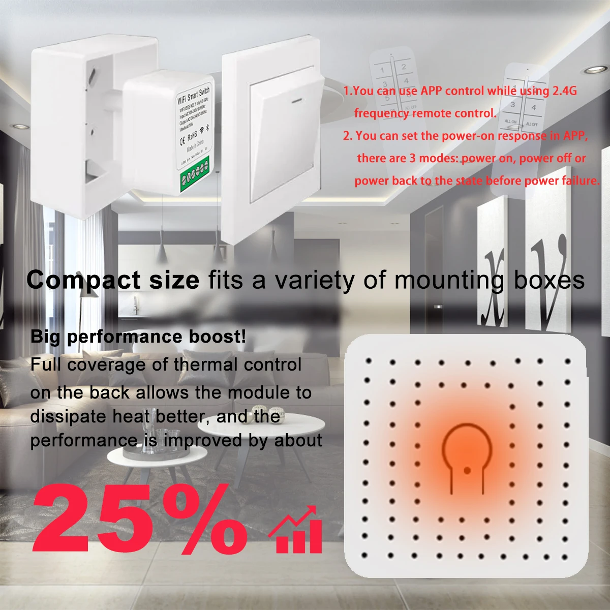 - Operates through RF and Wi-Fi communication, enabling wireless control via easy-to-use app, compatible with eWelink, Alexa, Google Home, and Alice for a smart home setup.
