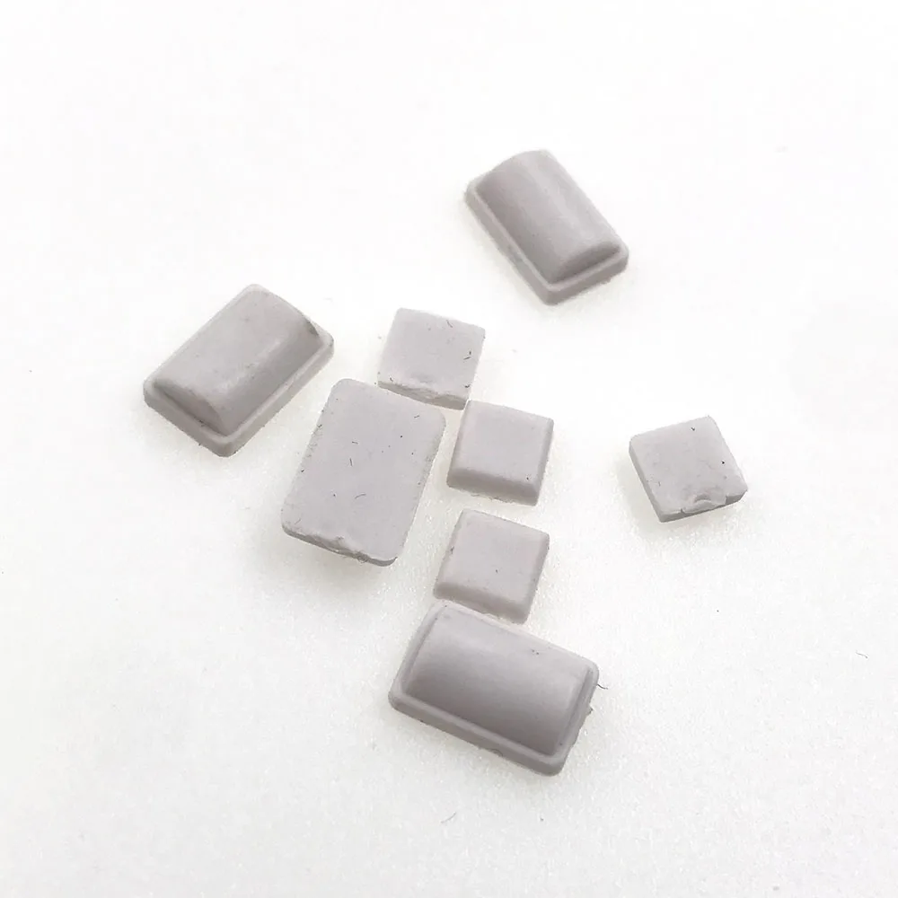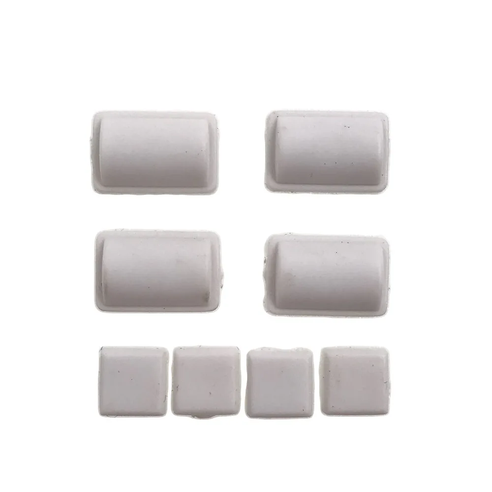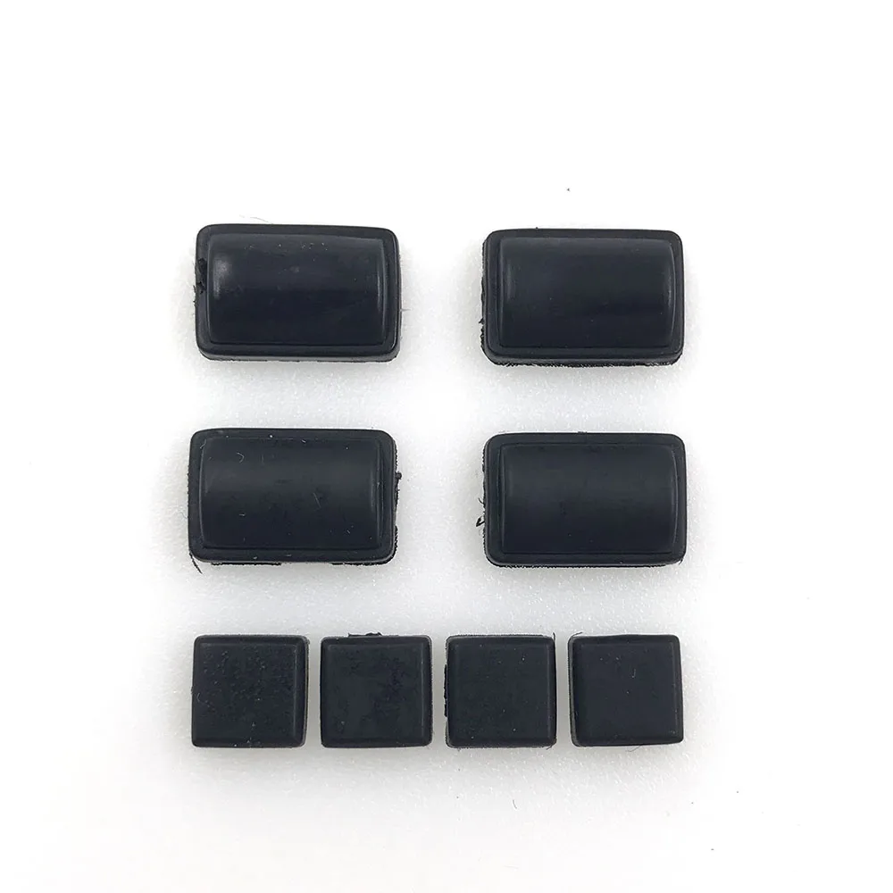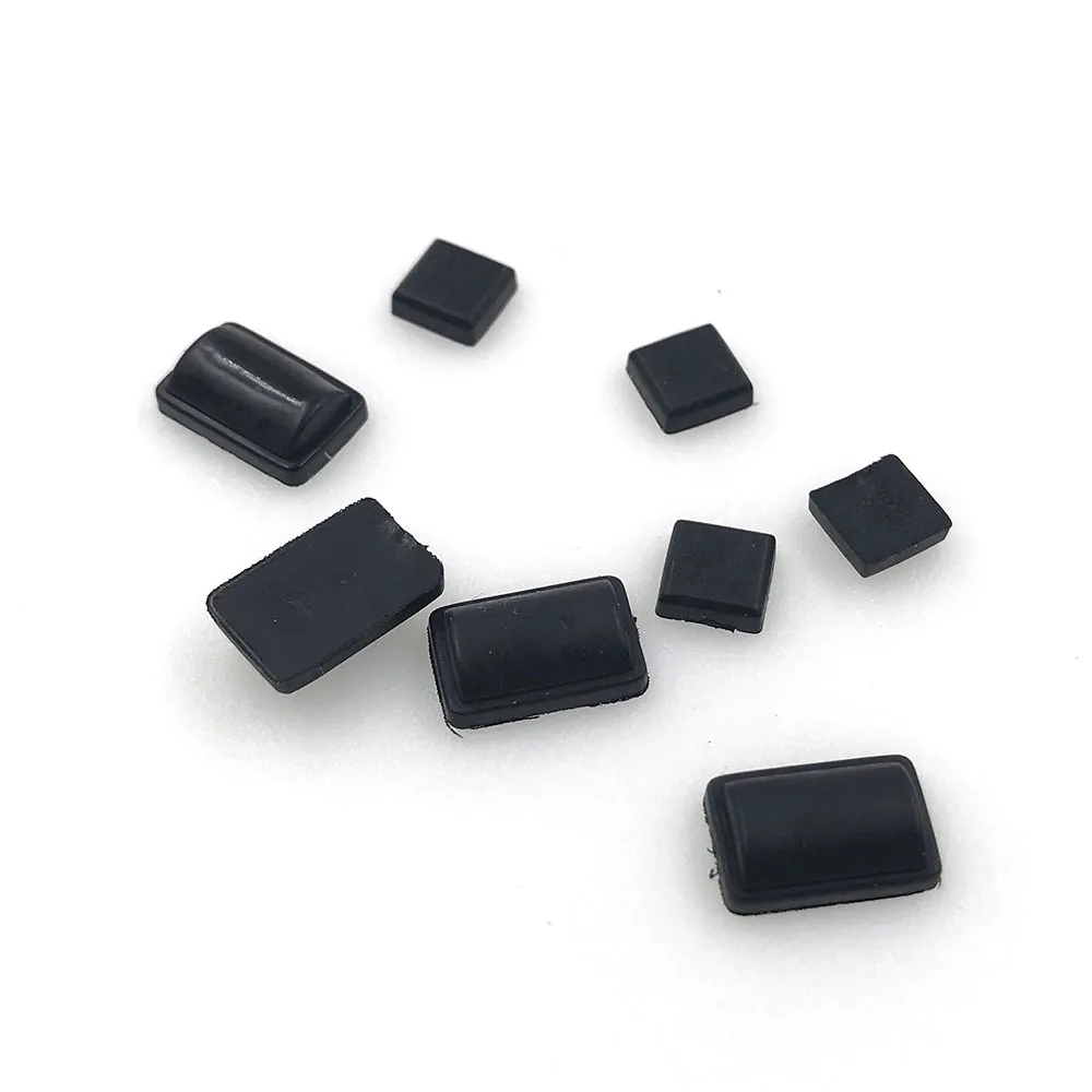 - Large rectangular rubber pads with a shiny surface serve as anti-slip feet, while smaller square plugs and covers prevent dust, ensuring cleaner internal components and enhanced device longevity.
