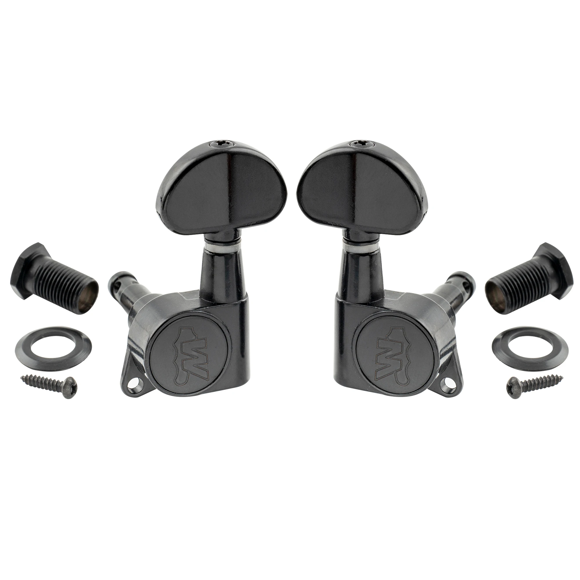 Imagine upgrading your guitar with this sleek set of Wilkinson 3R3L 19:1 ratio E-Z-LOK full sealed machine heads. Designed for both acoustic and electric guitars, these tuners offer precise tuning and durability in a stylish matte black finish. The compact, rounded-corner casings feature embossed Wilkinson branding, while the smooth, rounded tuning pegs provide an ergonomic feel. Enclosed gear housings crafted from high-quality metal alloy protect against dust and debris, ensuring long-lasting performance. Installation is straightforward, fitting standard 10mm (25/64 inch) peg holes, perfect for replacing old tuners or upgrading your instrument's look and functionality. Elevate your guitar's performance and style with these professional-quality tuners.