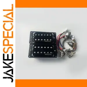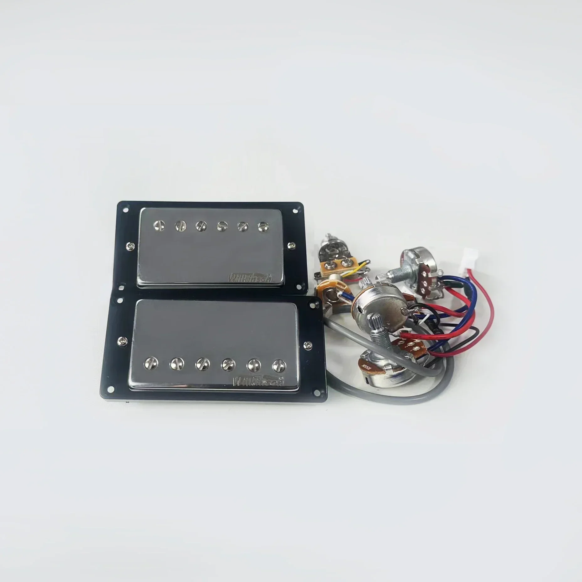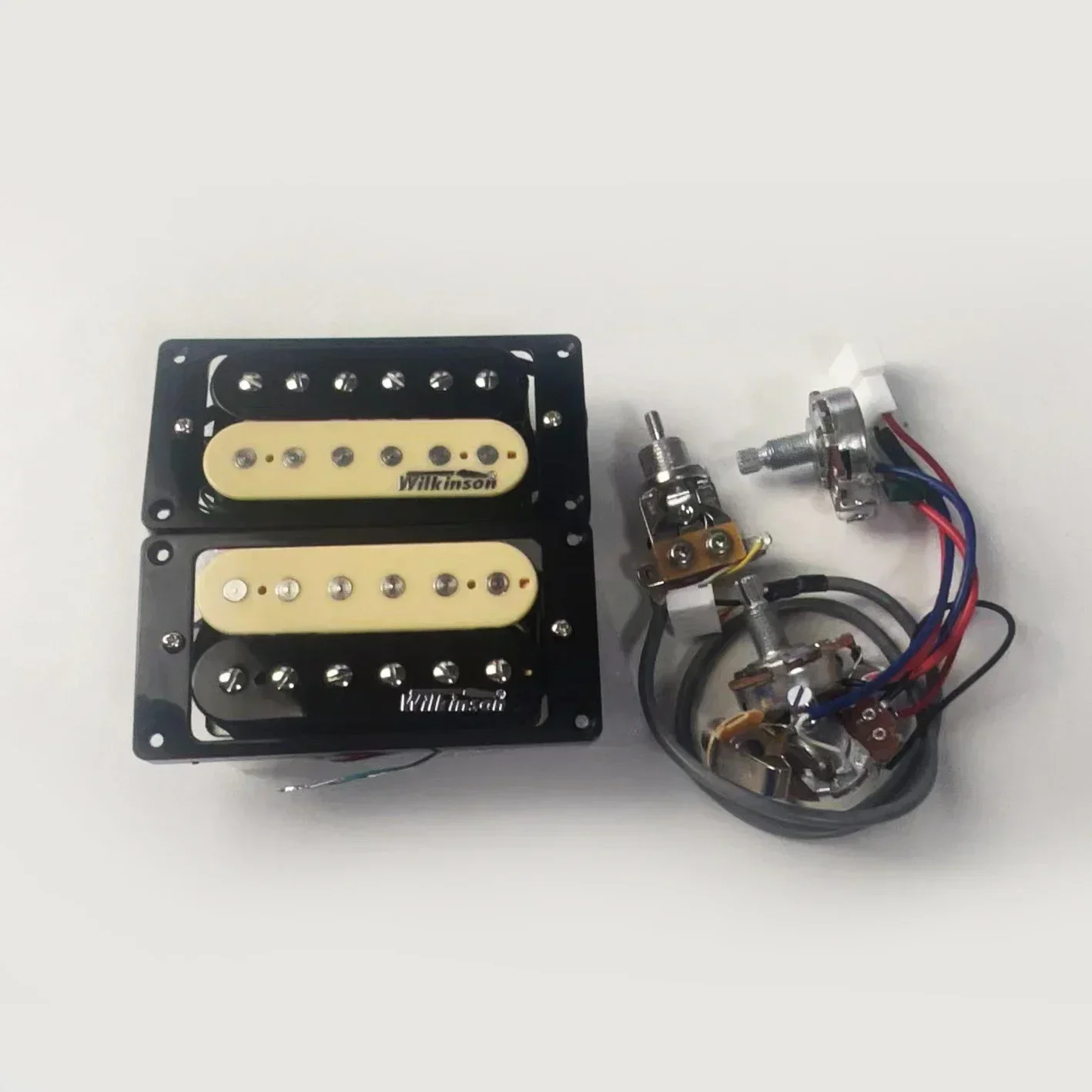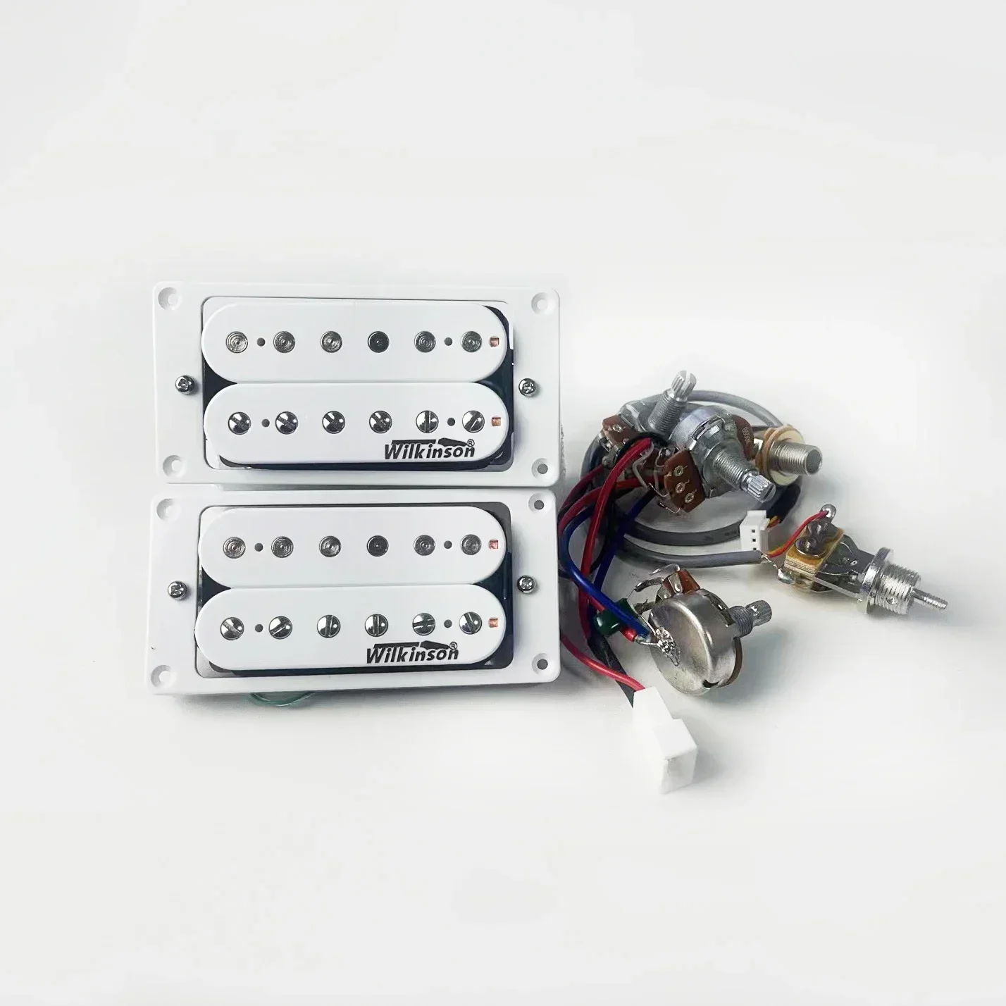 Elevate your guitar tone with this Wilkinson Ainico5 Humbucker Pickup Set, featuring sleek, glossy black pickups with adjustable pole pieces and a modern rectangular design. Equipped with Alnico 5 magnets, the set includes a neck pickup with 7.6kΩ resistance and 50mm length, and a bridge pickup with 14.6kΩ resistance and 52mm length, delivering rich, dynamic sound. The comprehensive wiring harness features one toggle switch, four high-quality potentiometers—two B500 push-pull switches and one A500K—and a reliable jack, all made from durable metal and plastic components. Available in multiple finishes including black, chrome, gold, and white, this professional-grade set seamlessly fits all electric guitars, especially LP Standard models.