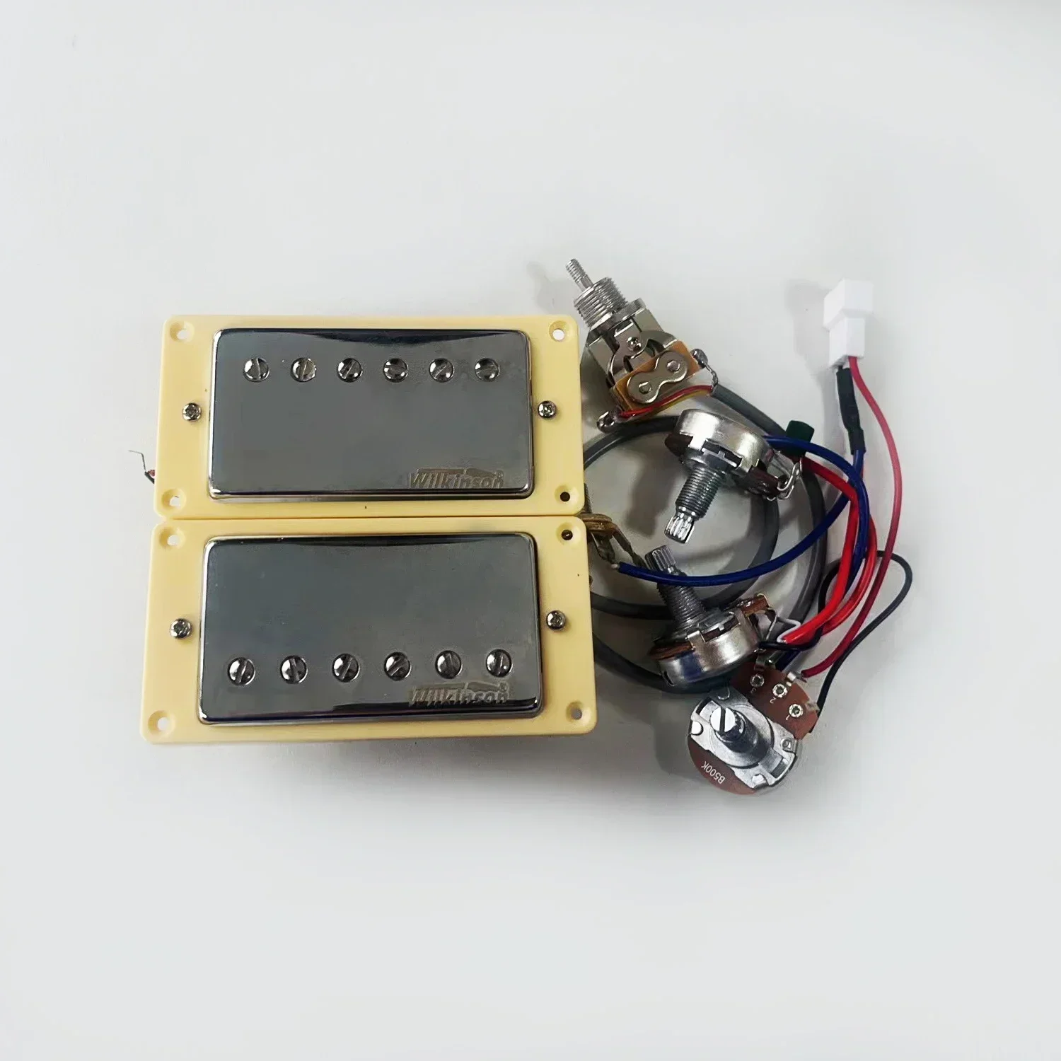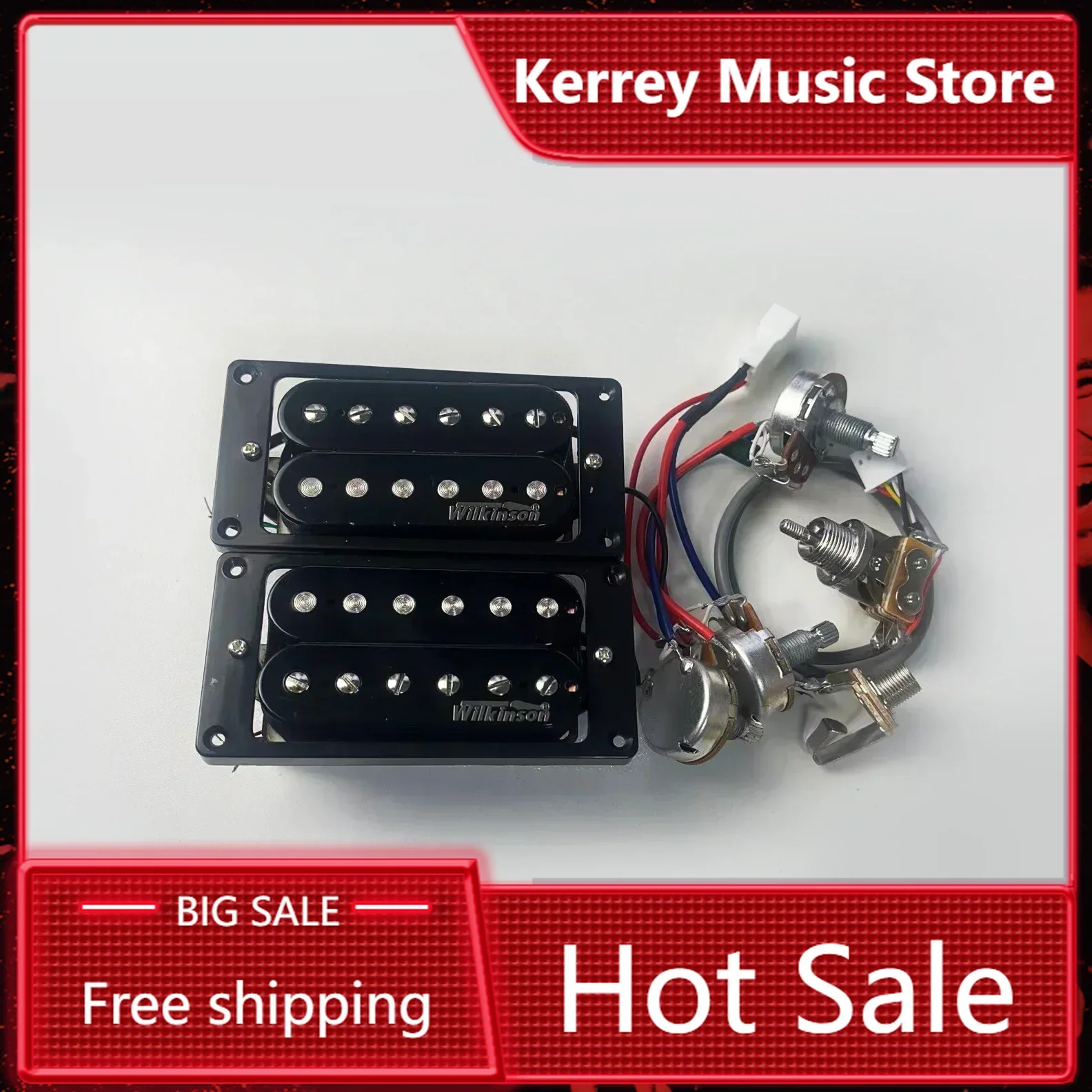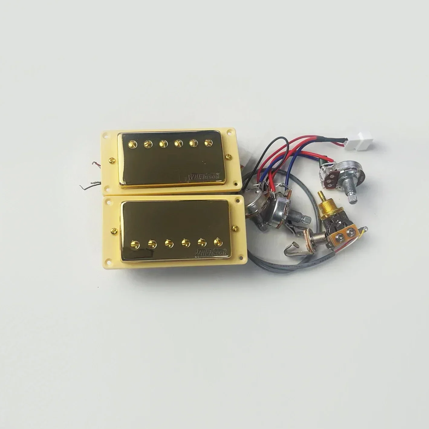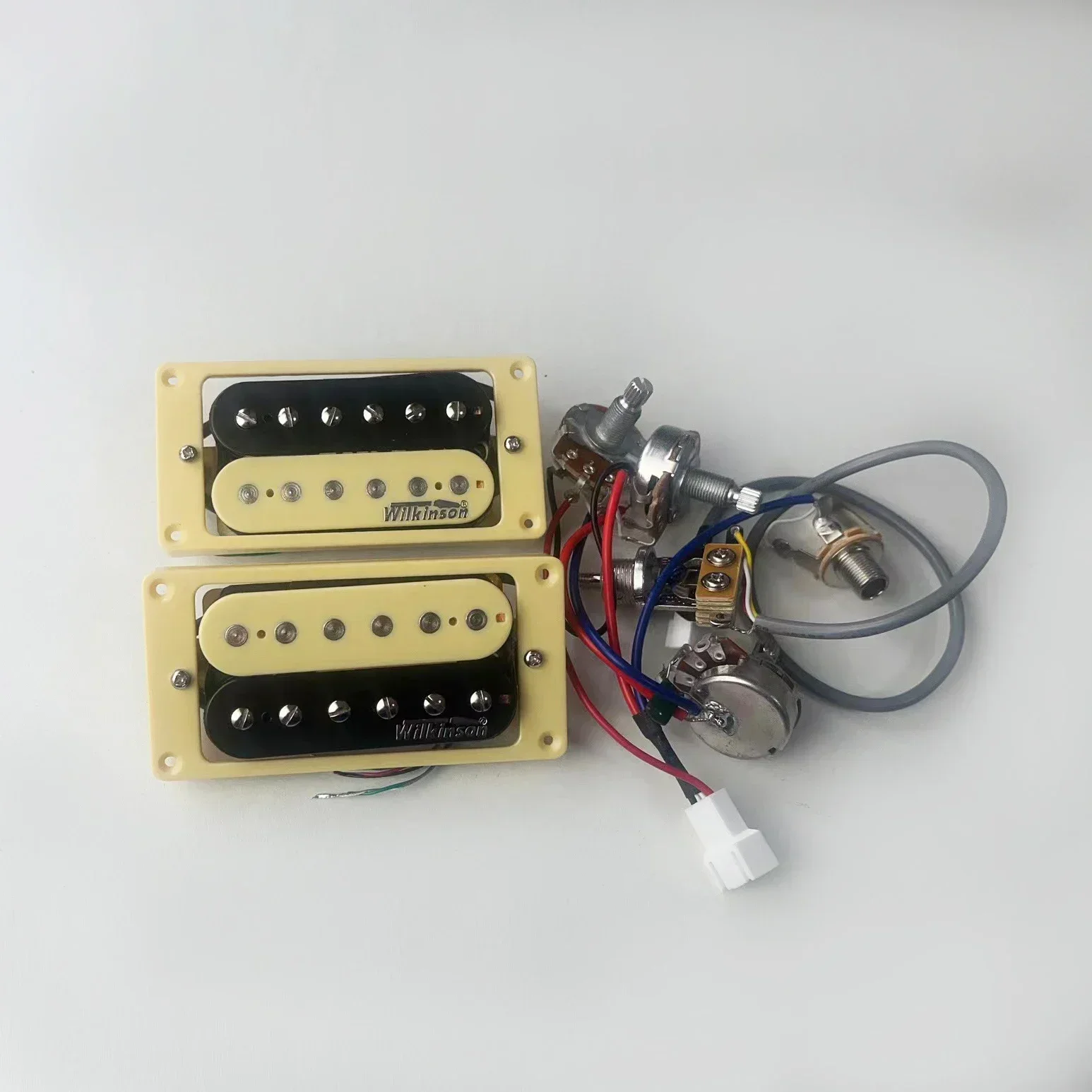 Elevate your guitar tone with this Wilkinson Ainico5 Humbucker Pickup Set, featuring sleek, glossy black pickups with adjustable pole pieces and a modern rectangular design. Equipped with Alnico 5 magnets, the set includes a neck pickup with 7.6kΩ resistance and 50mm length, and a bridge pickup with 14.6kΩ resistance and 52mm length, delivering rich, dynamic sound. The comprehensive wiring harness features one toggle switch, four high-quality potentiometers—two B500 push-pull switches and one A500K—and a reliable jack, all made from durable metal and plastic components. Available in multiple finishes including black, chrome, gold, and white, this professional-grade set seamlessly fits all electric guitars, especially LP Standard models.