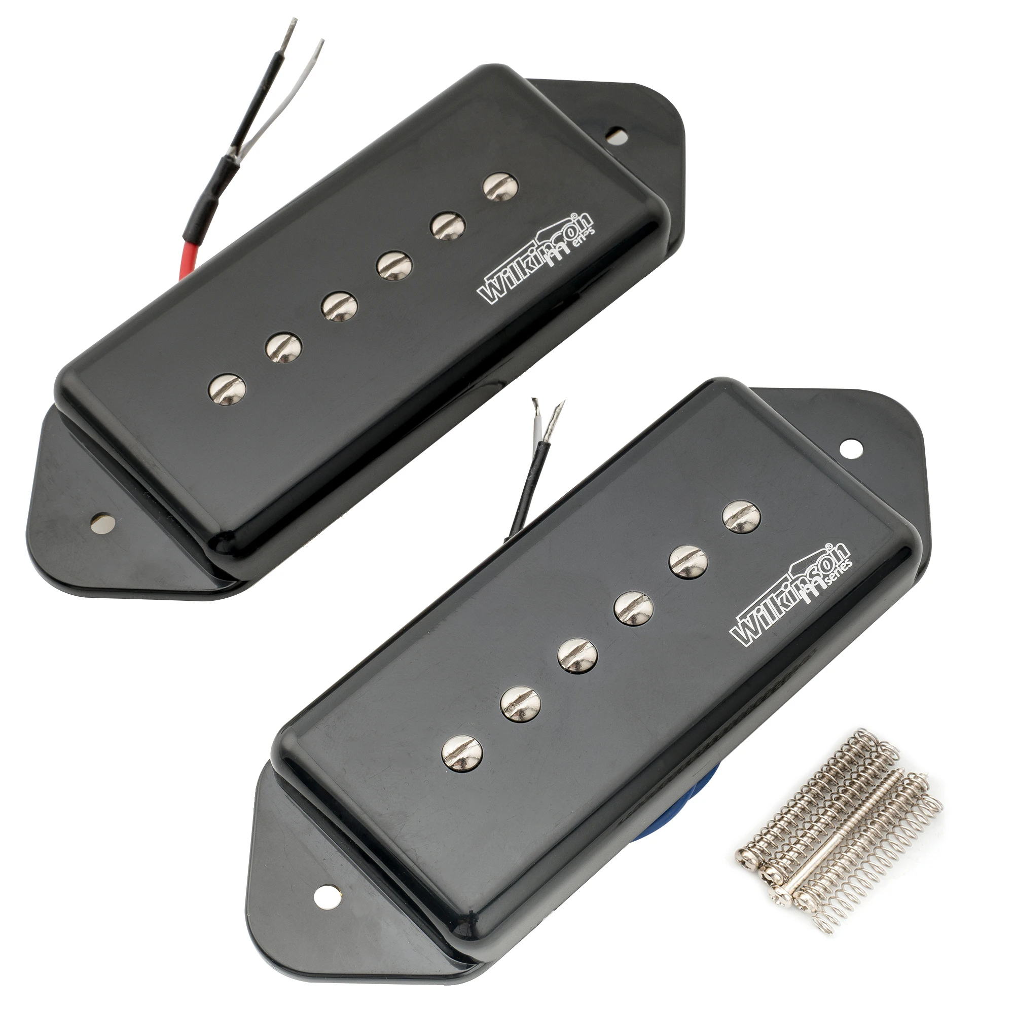 Enhance your electric guitar’s tone with the Wilkinson M Series Low Gauss Iconic Sound P90 Dogear Style pickups, available in black. Featuring a classic medium dogear shape and polepiece spacing of 50mm (1-31/32″), these pickups are wax potted with ceramic magnets, delivering authentic P90 sound. The neck pickup has a DC resistance of 8.1K ohms, while the bridge is 9.8K ohms, both with a tolerance of 0.5K ohms. Designed for SG, Les Paul, Ernie Ball Axis series, Epiphone Casino, and Fender Tele guitars, they include mounting hardware, with the white wire as hot, offering a reliable upgrade that combines vintage style with exceptional sound quality.