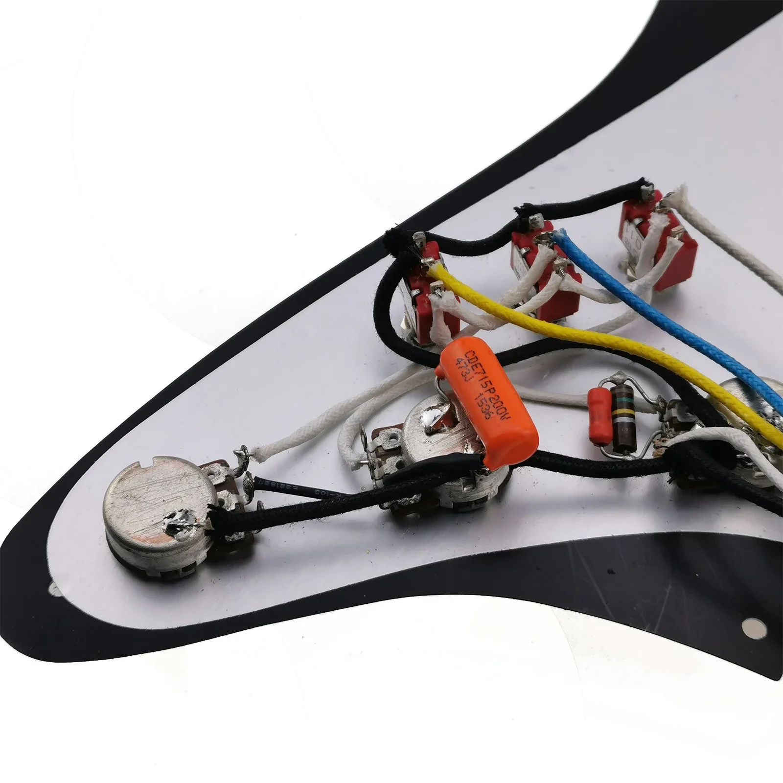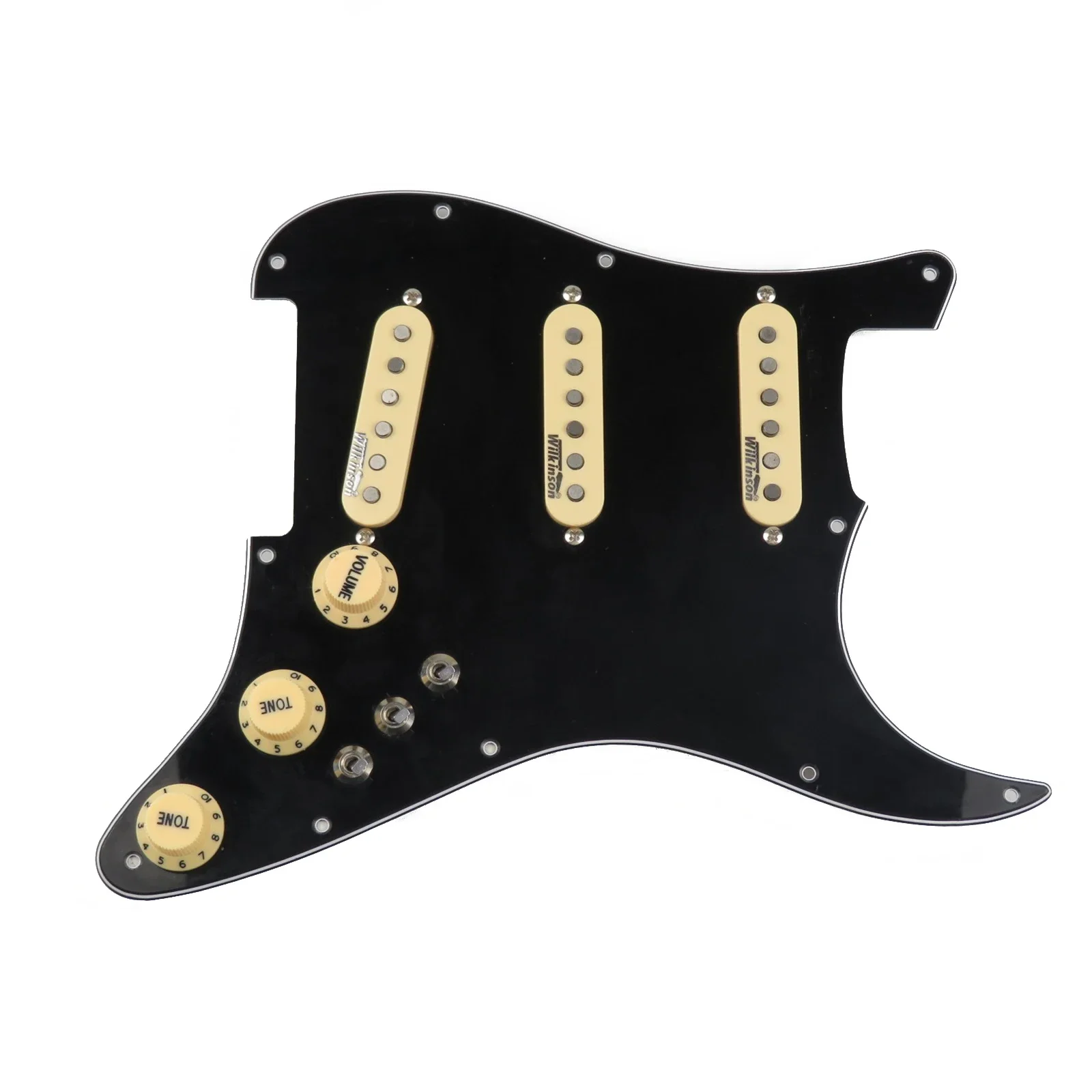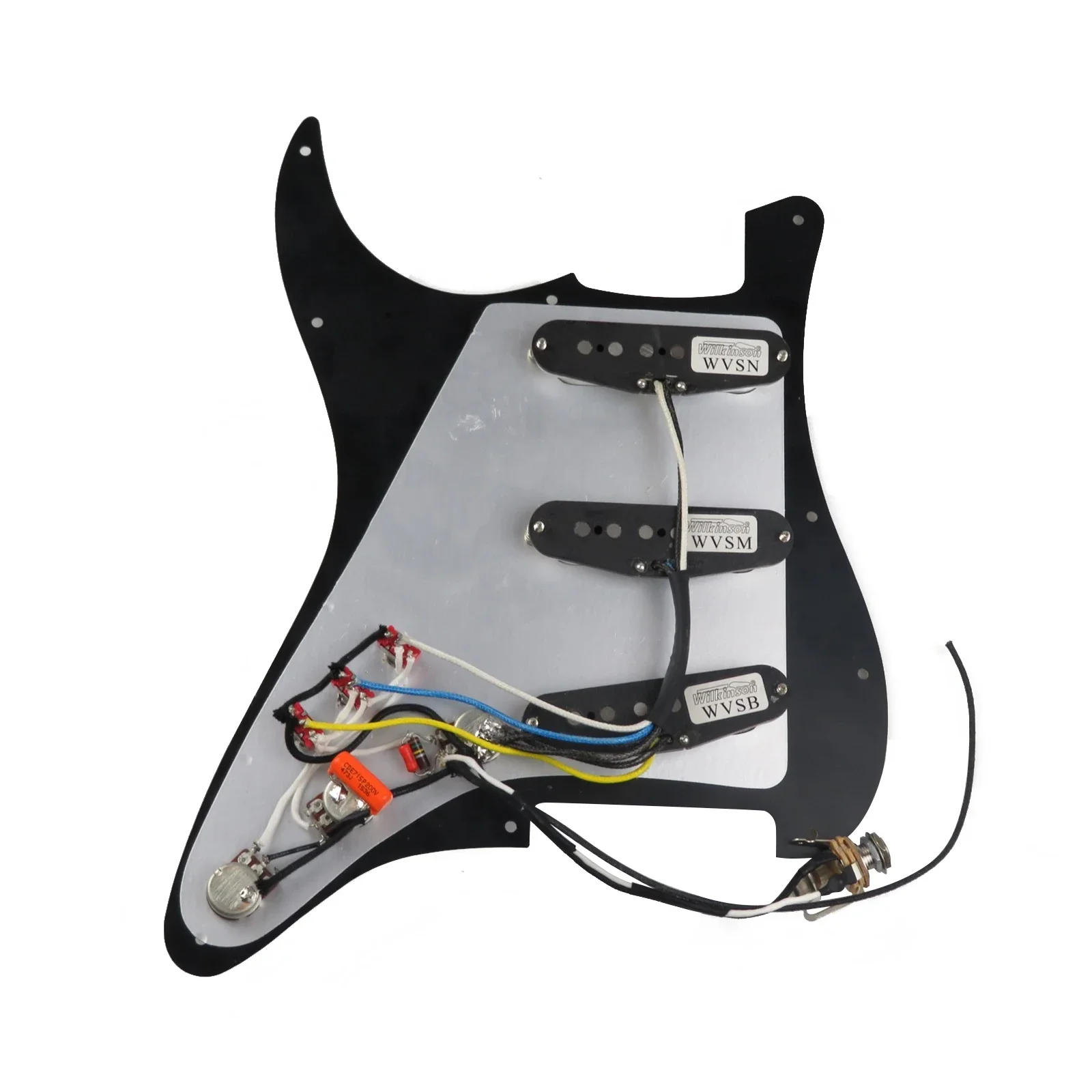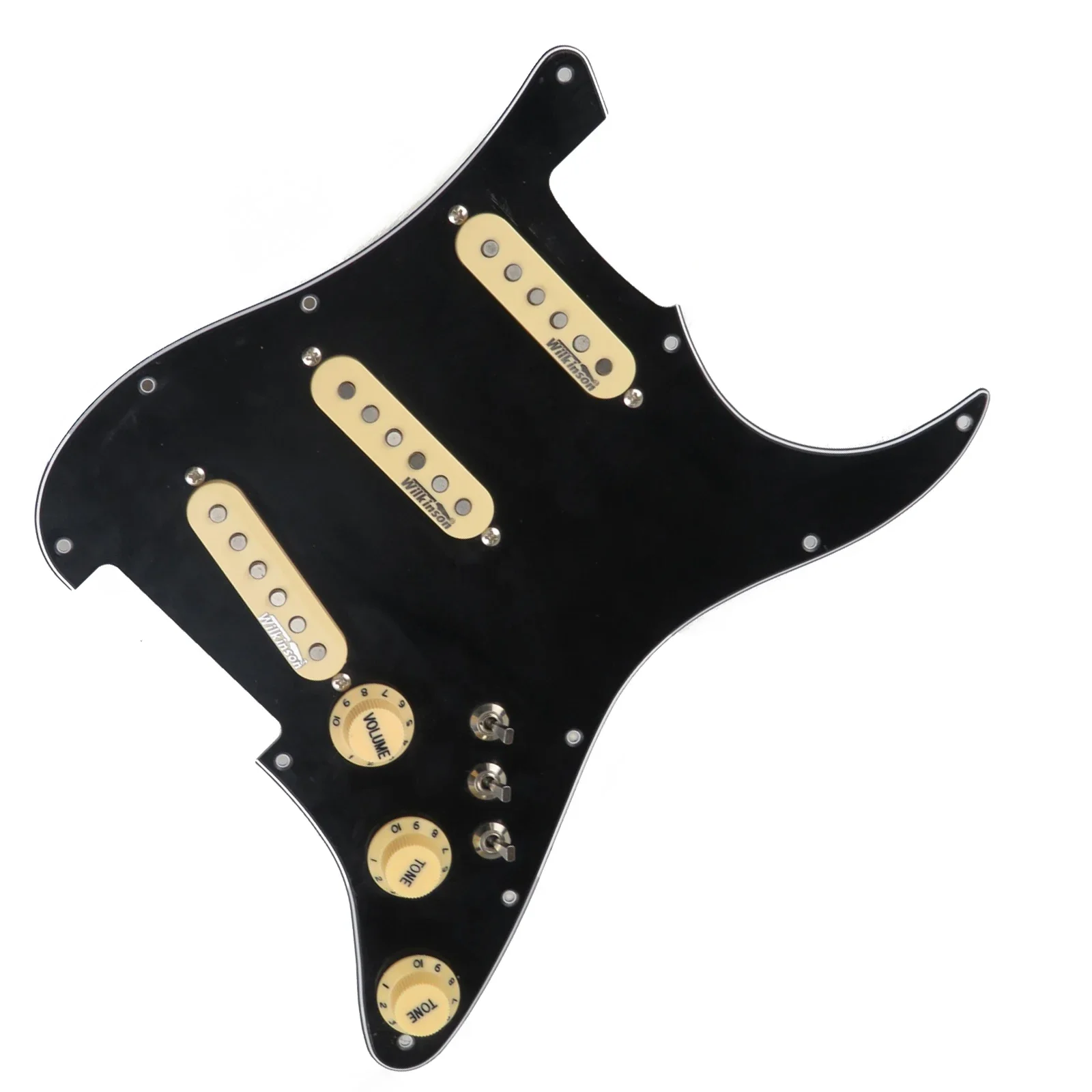 - Prewired SSS pickguard compatible with Squier Stratocaster guitars, ready for quick installation without soldering.