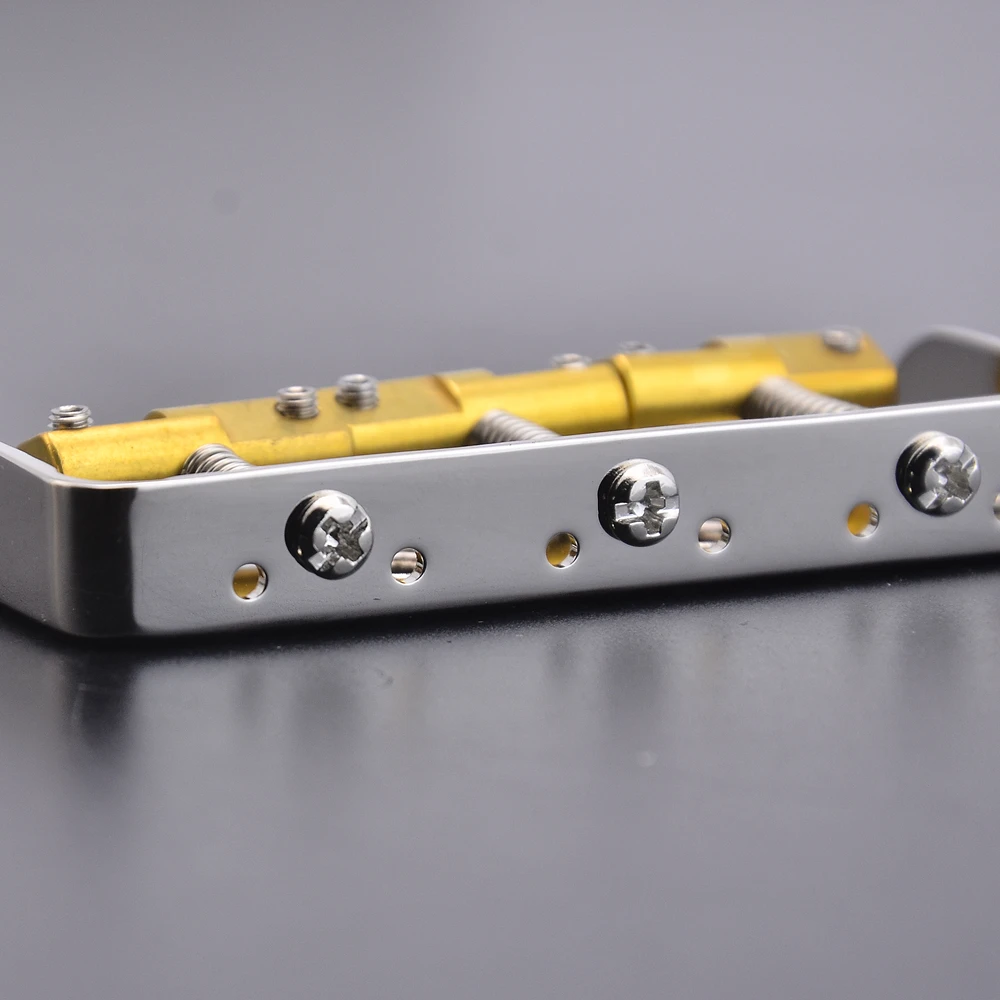 - Six adjustable brass saddles with precision screw slots allow for customized height and intonation settings.
