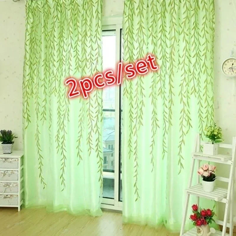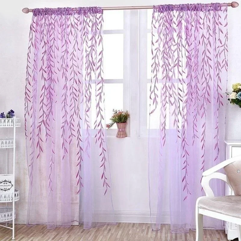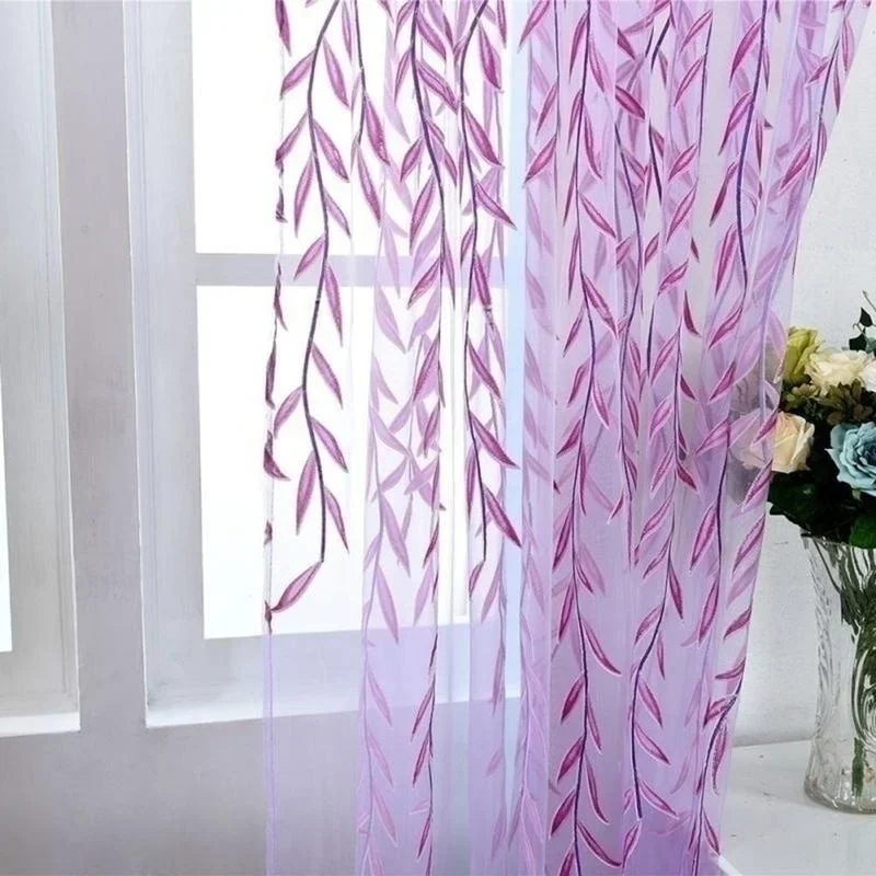 Enhance your space with this elegant set of two polyester curtains, available in sizes 100x200cm and 100x270cm, featuring a delicate willow leaf floral pattern in soothing green and purple hues. Crafted from semi-transparent voile with a woven interlaced texture, these curtains offer a shading rate of 1% to 40%, perfect for soft sunlight diffusion. Their good drape and lightweight feel create a relaxed, pastoral ambiance ideal for bedrooms, living rooms, cafes, or offices. Designed for built-in installation on flat windows with left and right biparting opening, they combine style, functionality, and a touch of natural charm to elevate your interior decor.