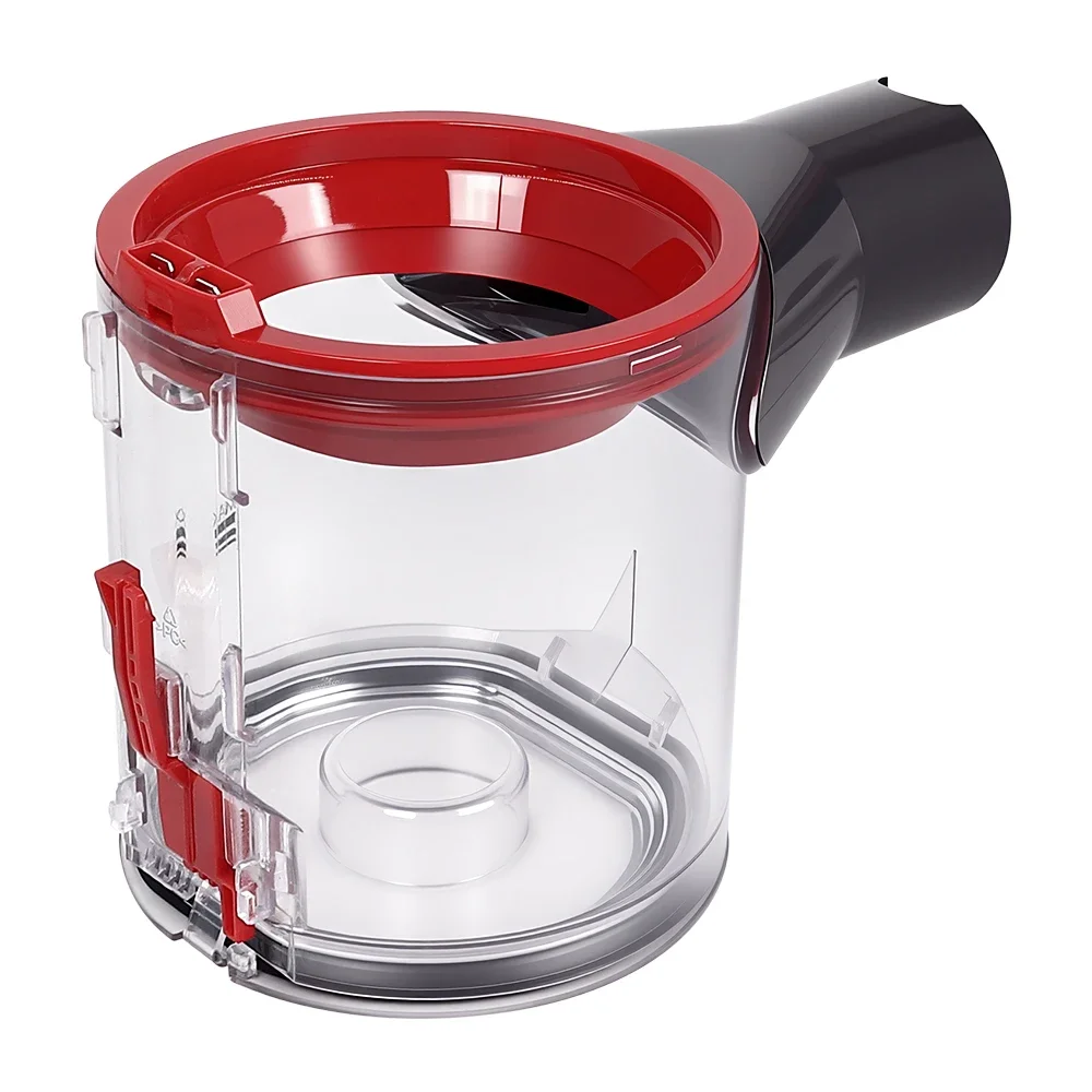 Experience the convenience and sleek design of this handheld wireless vacuum cleaner dust bin, perfectly compatible with Dyson models V7 and V8, including SV10 and SV11 series. Crafted from clear, lightweight plastic, the transparent body allows you to see when emptying is needed, making maintenance effortless. Its rounded, cylindrical shape with a flat base ensures stability and easy handling. The bold, glossy red lid features a smooth finish and a raised rectangular tab for secure sealing and easy removal. The attached dark gray tubular extension adds a modern industrial touch and facilitates attachment to your vacuum. This high-quality replacement part combines durability with style, ensuring your cleaner performs efficiently while maintaining a contemporary look.