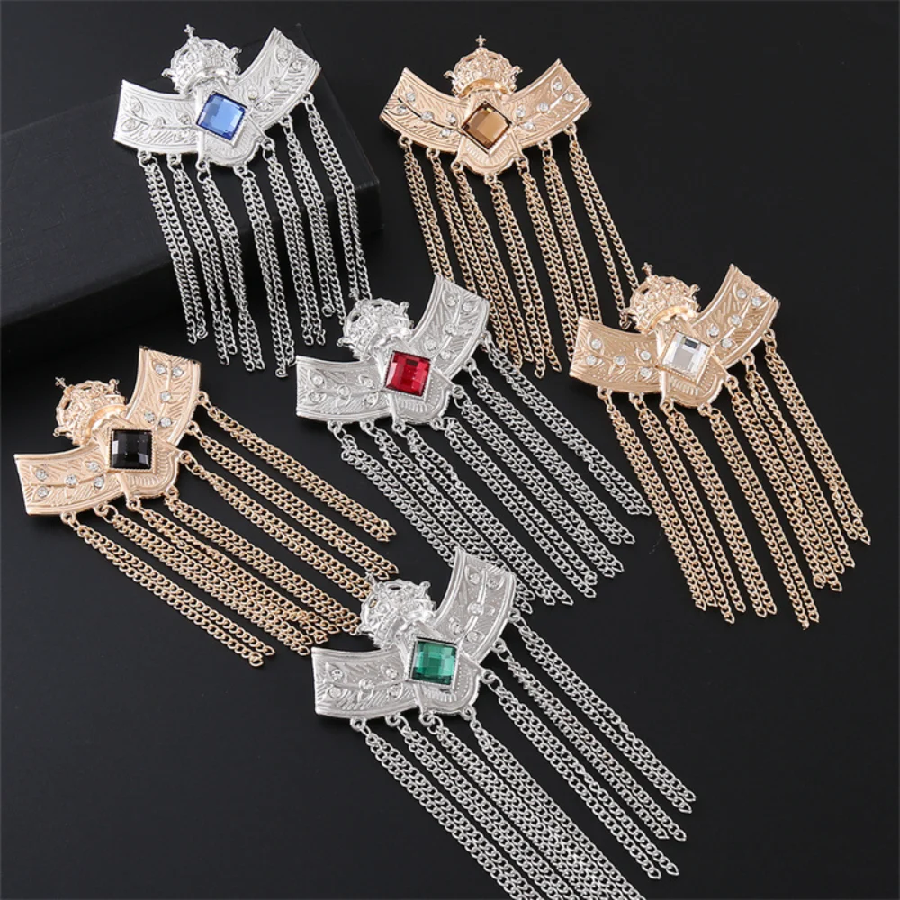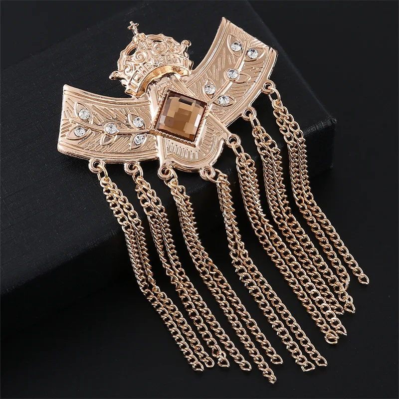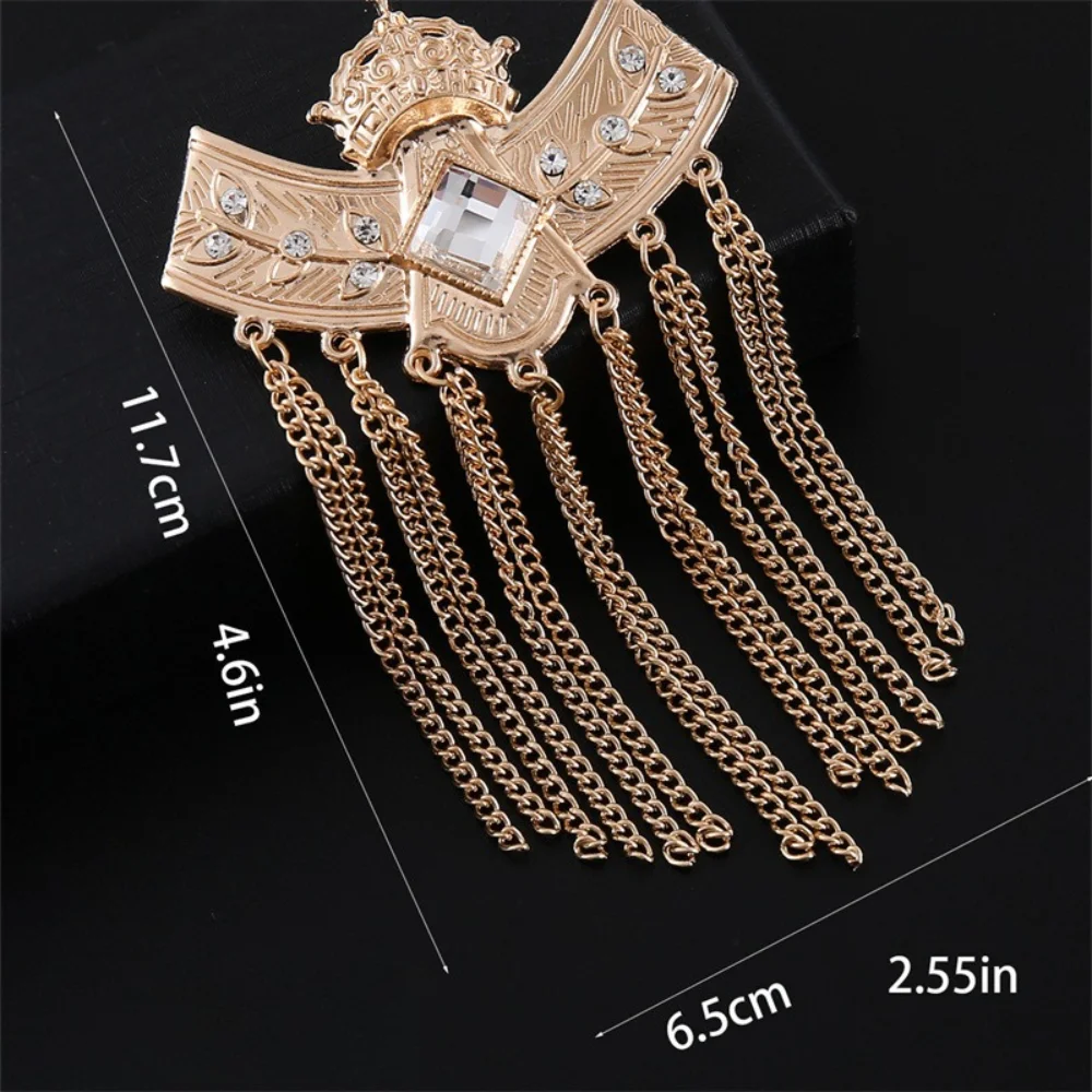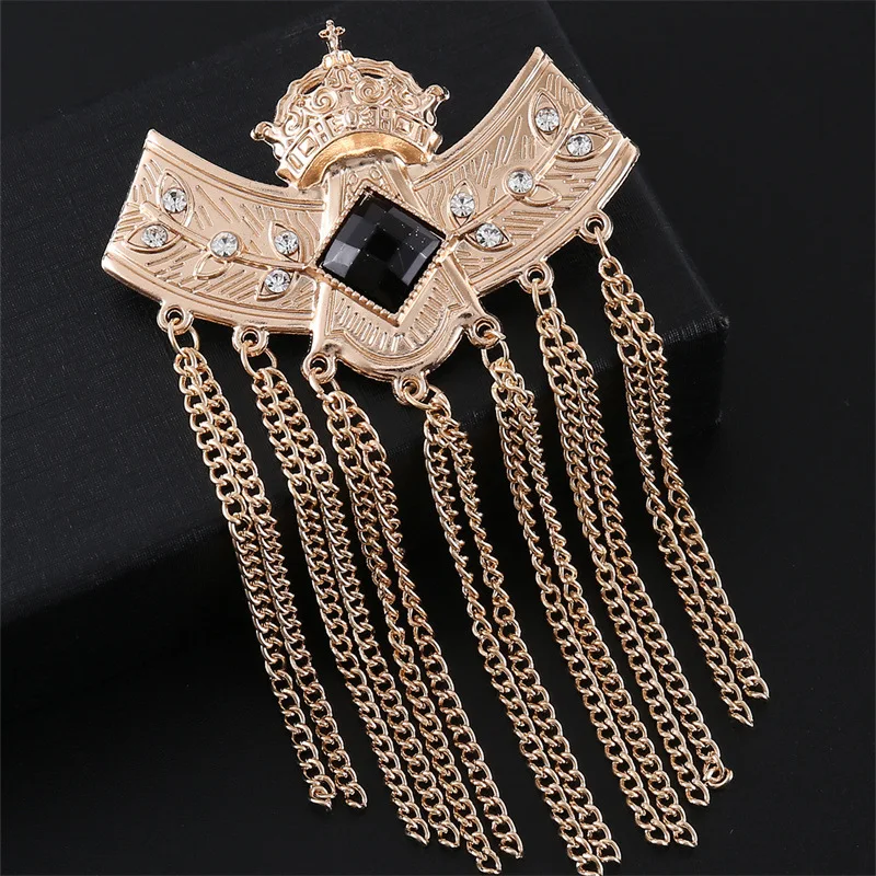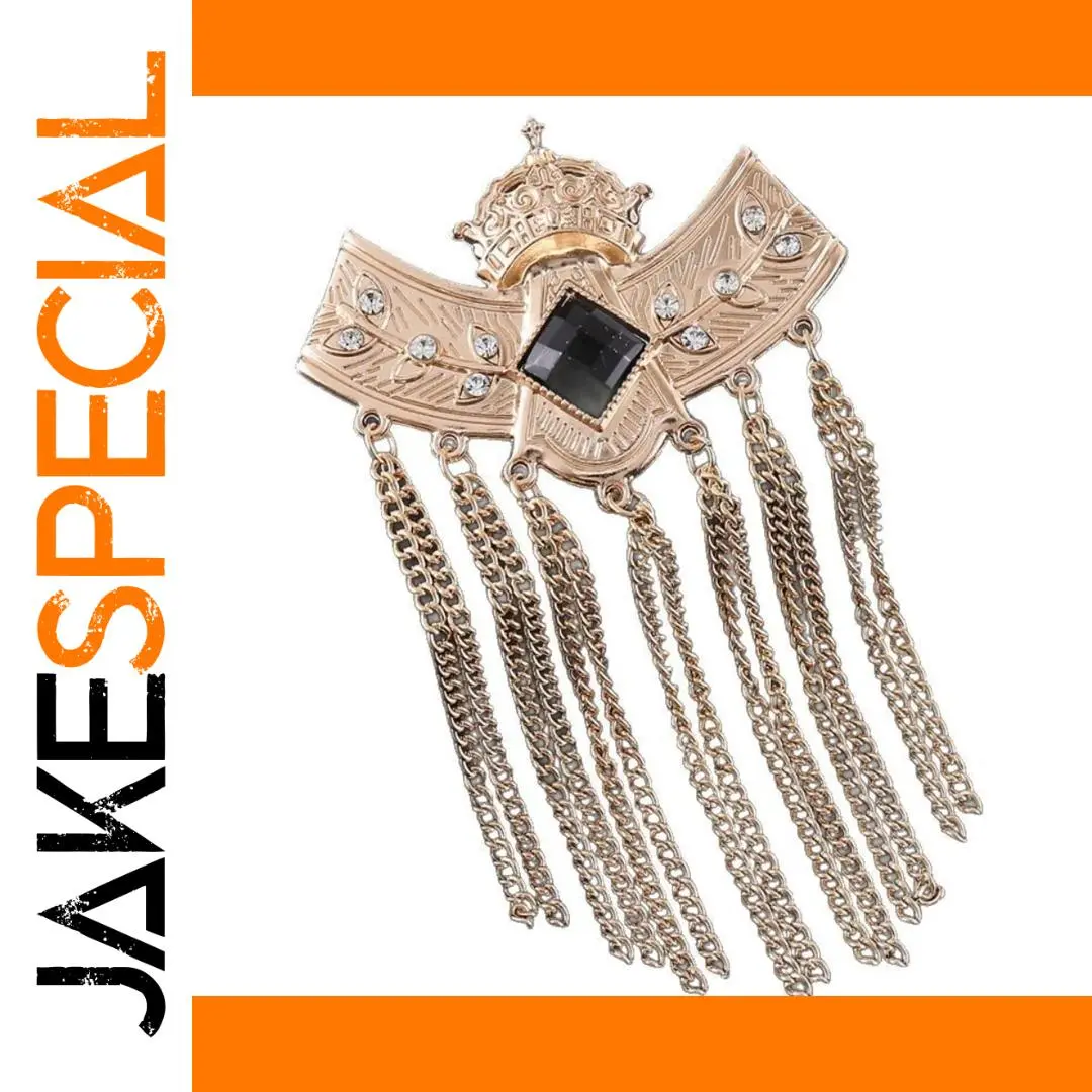Discover the perfect accessory to elevate your style with this exquisite wing crown tassel brooch. Crafted from high-quality alloy, it features a stunning vintage design inspired by regal and gothic aesthetics. The brooch boasts a shiny gold-colored wing adorned with engraved feather details and a sparkling array of tiny rhinestones, creating a textured, layered look that catches the eye. A central black gemstone adds a bold focal point, while a delicate crown sits atop the wing, emphasizing its royal charm. Varying length tassel chains dangle from the bottom, adding movement and grace to the piece. Versatile and striking, this brooch seamlessly complements a wide range of fashion styles and accessories, making it a must-have for enthusiasts of vintage, punk, gothic, and elegant looks.