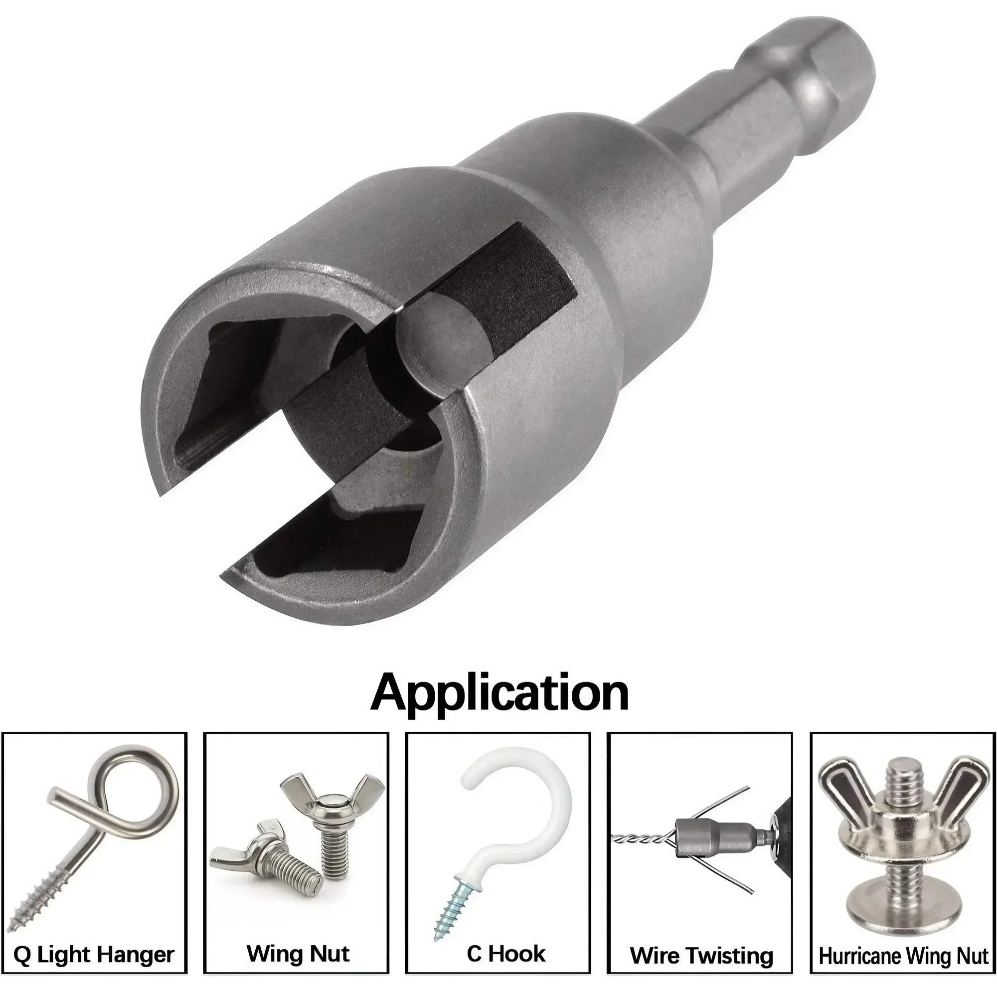 Enhance your toolkit with this versatile wing nut drill socket wrench set featuring a durable steel construction and a sleek grey finish. Measuring 18 x 18 x 65 mm with a 1/4 inch hex shank, it includes a slotted socket, hex shank wing nut socket, and butterfly socket design, ideal for driving and removing power wing nuts, bolts, and hooks. Crafted for reliable performance, this 65mm long tool is perfect for various mechanical and assembly tasks, offering practical ease and a streamlined, industrial aesthetic for both professional and DIY use.