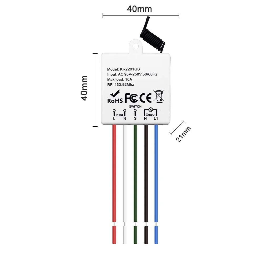 - The receiver module is a compact rectangular white box supporting AC voltage from 90V to 250V, with a maximum current of 10A and a load capacity of 2200W for reliable operation.