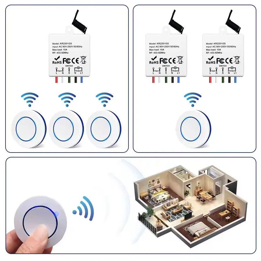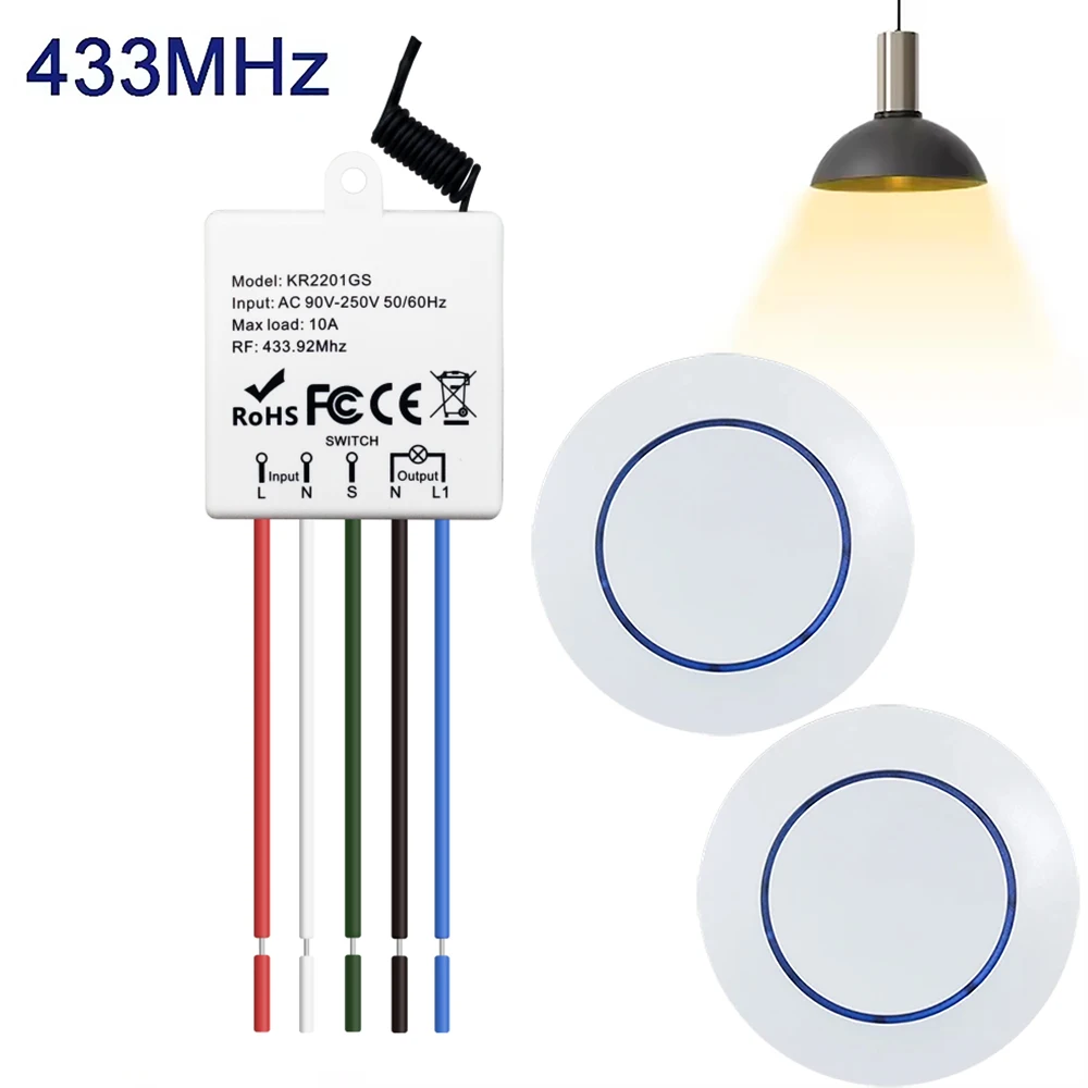Imagine effortlessly controlling your lighting with this stylish, minimalistic switch that blends seamlessly with modern interiors. Designed for adult use, this product features a clean, round white wall-mounted switch highlighted by a subtle blue illuminated ring, indicating its electronic nature. The switch connects wirelessly to a compact receiver module, allowing you to operate your lights up to 50 meters outdoors and approximately 15 meters indoors. Its intuitive remote control with a single button provides convenient on/off functionality. Built for durability and safety, the system supports a maximum load of 2200W, operates within a wide voltage range of 90V to 250V AC, and includes versatile modes like momentary, toggle, and latched. Celebrate smarter lighting now with this reliable wireless switch system.