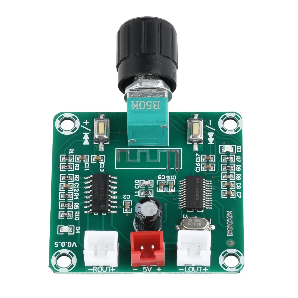 Experience high-quality wireless audio with this compact Bluetooth audio amplifier board. Designed for seamless integration, it features a sleek green PCB with clear silkscreen markings for easy installation. The black PAM8403 chip ensures crisp, stable sound output, supporting dual channels with a combined power of 10W. Equipped with Bluetooth 5.0, it guarantees a stable connection, longer range, and compatibility with various devices. The board’s organized layout includes power and Bluetooth status LEDs, intuitive volume controls via buttons and a rotary knob, and accessible terminal connectors for connecting two 5W speakers. Its precise dimensions of 45mm x 42mm x 25mm make it ideal for a variety of custom audio projects. Simply connect, pair, and enjoy your favorite music with sound quality you can trust.