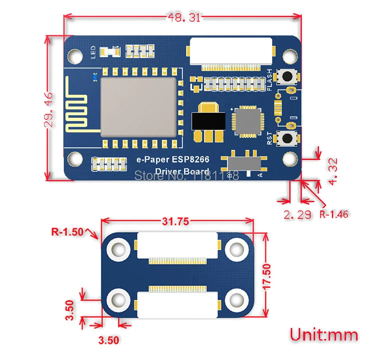 Experience seamless wireless control with this sleek universal e-Paper driver board featuring an onboard ESP8266 WiFi SoC supporting 802.11b/g/n protocols. Measuring just 29.57mm x 48.26mm with 2.9mm mounting holes, it supports both 3-wire and 4-wire SPI interfaces at 5V and 50mA to 100mA. The board enables remote display updates via WiFi, supporting multiple image formats including BMP, JPEG, GIF, and PNG, with enhanced shadow rendering through Floyd-Steinberg dithering. It comes complete with an e-Paper adapter and a 24PIN FFC connector, making it ideal for wireless applications, development projects, or smart display integrations.