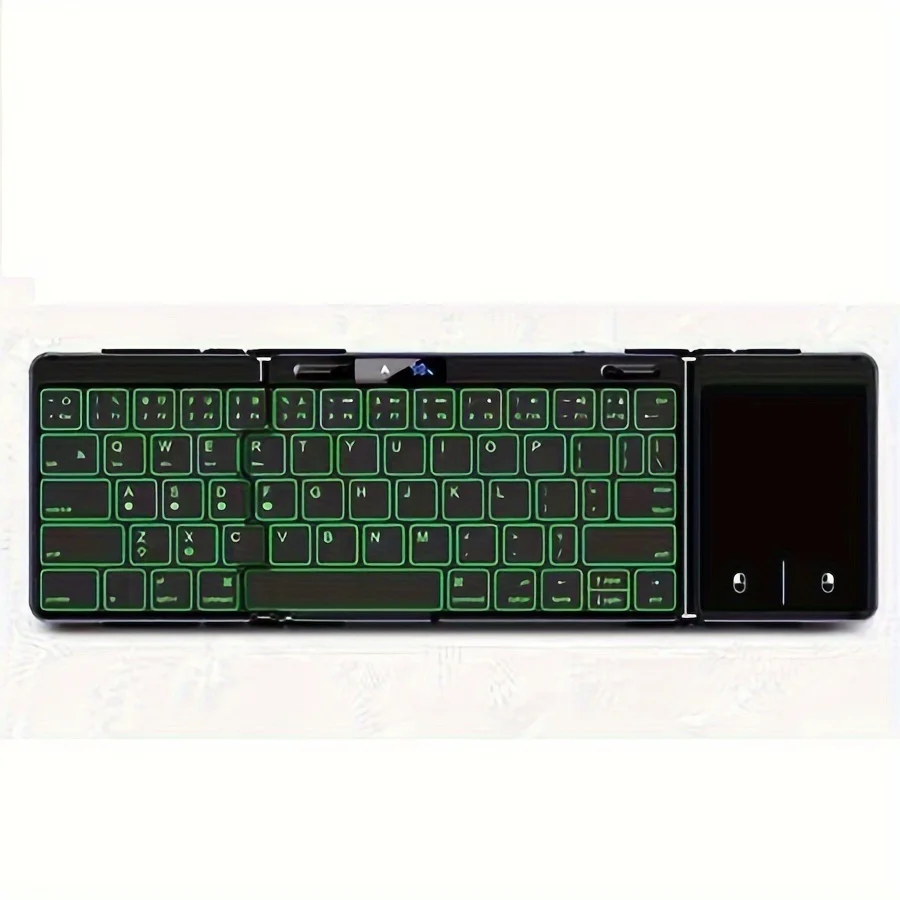 Experience the ultimate in portable productivity with this sleek wireless foldable Bluetooth keyboard. Designed with a modern aesthetic, it combines a matte black finish with vibrant RGB backlighting that illuminates the keys in multicolor hues, creating an eye-catching glow. Its slim profile and foldable structure make it easy to carry, ideal for professionals on the go or casual users seeking a stylish accessory. The full-size ergonomic layout ensures comfortable typing, while the integrated touchpad adds convenience. With support for multiple languages including English, Hebrew, Korean, Russian, Portuguese, and Spanish, this versatile keyboard adapts seamlessly to your needs. Rechargeable and lightweight, it provides long-lasting performance for all your digital tasks.