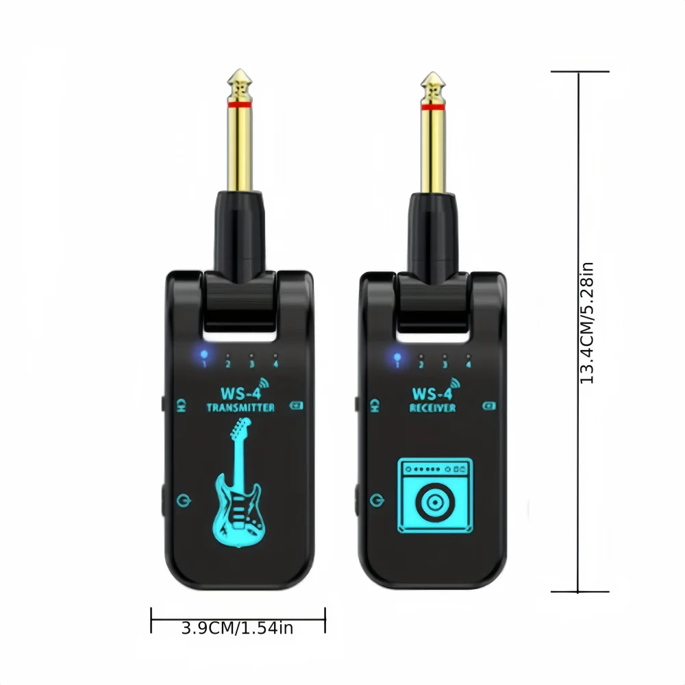 Experience seamless wireless play with this 2.4G Guitar System, featuring a rechargeable transmitter and receiver compatible with electric guitars and basses. Designed for plug-and-play simplicity, it offers low latency for smooth performance during live shows or practice. The sleek black exterior with vibrant cyan graphics and LED indicators adds a modern touch, while the stable 2.4 GHz frequency ensures reliable wireless connectivity. Perfect for musicians seeking cord-free freedom, this system combines ease of use, durable construction, and high-performance audio transmission to enhance your musical sessions.Enjoy the freedom of wireless guitar performance with this sleek 2.4G system, including a rechargeable transmitter and receiver designed specifically for electric guitars and basses. Its plug-and-play setup ensures effortless use, while low latency guarantees real-time sound without lag, making it ideal for live performances or practice. With a modern glossy black finish accented by bright cyan graphics, the devices feature smooth, rounded edges and intuitive LED indicators—all crafted for durability and reliable wireless connection. Whether you’re on stage or in your studio, this system offers stable, cord-free operation, allowing you to focus solely on your music.