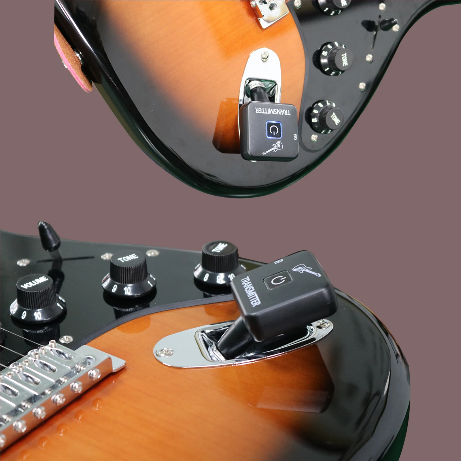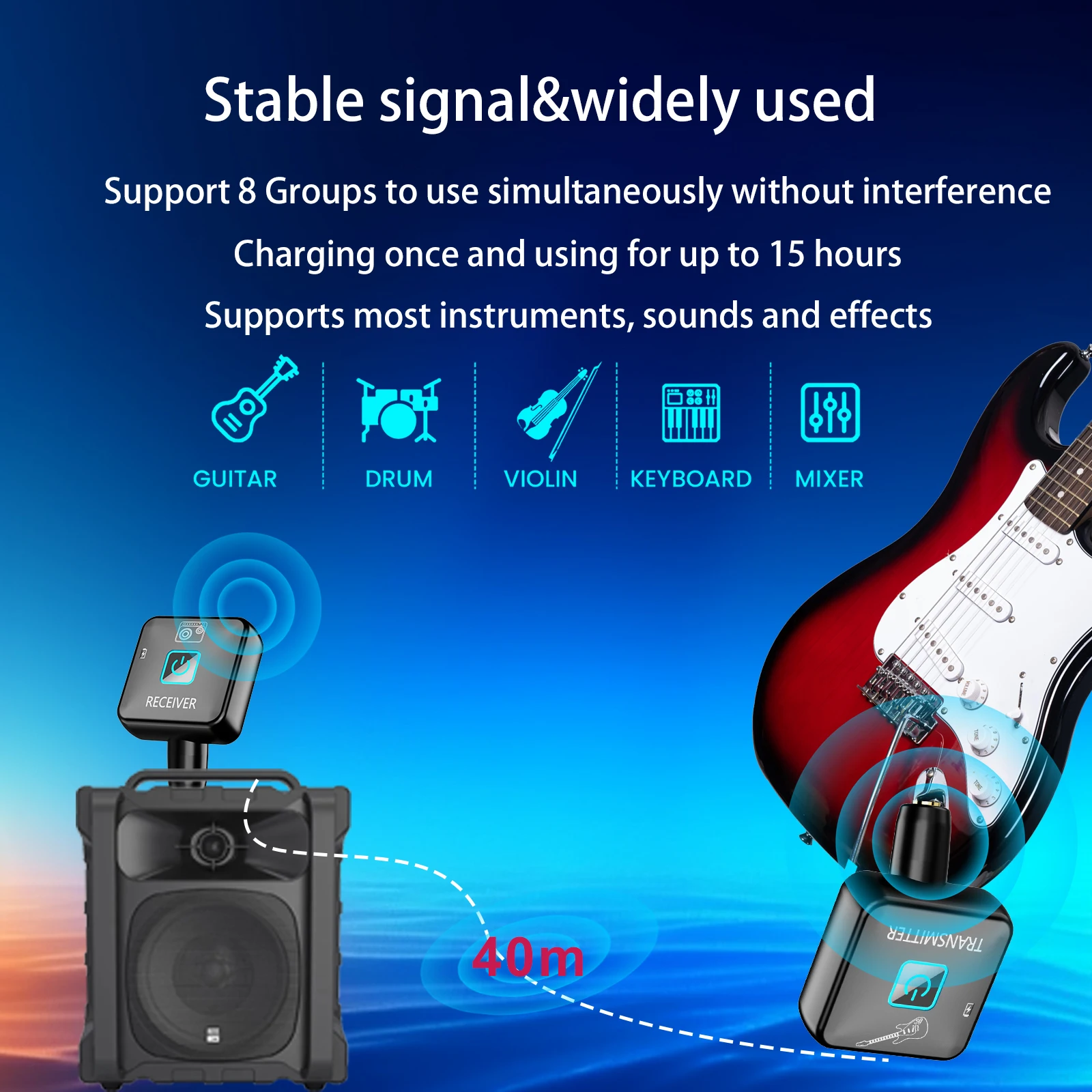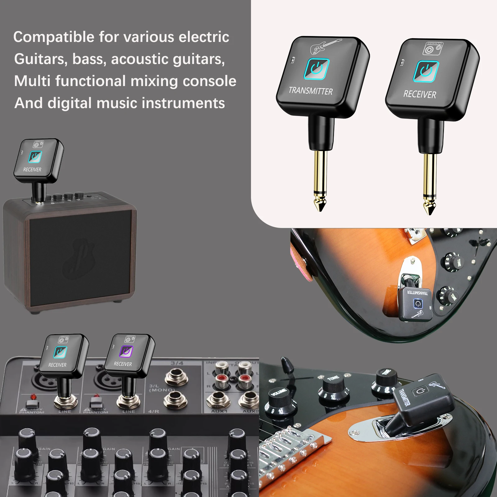 The Wireless Guitar System offers advanced 2.4GHz uncompressed wireless signal transmission for low noise and latency, operating effectively within a range of approximately 30 meters. It supports simultaneous use of up to 4 sets of devices without interference. Choose between model MB-10, which includes one transmitter and one receiver, or model MB-11, which comes with two transmitters and one receiver. The system features a built-in rechargeable lithium battery for long use and includes a USB charging cable for convenience. It utilizes a 1/4″ plug, ensuring compatibility with electric instruments and various input jack positions.