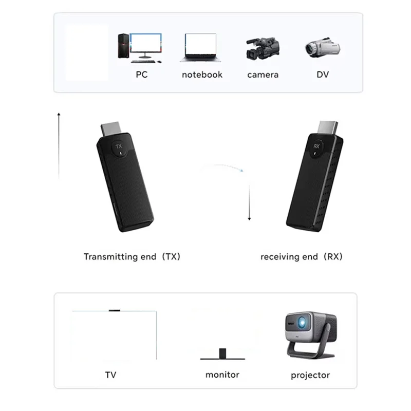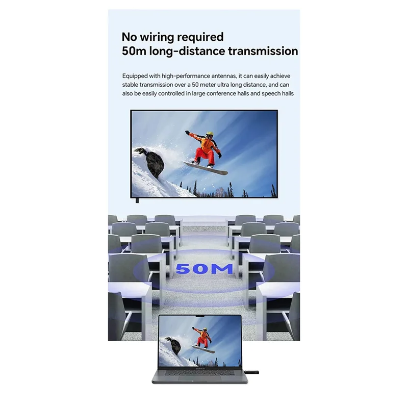 Experience seamless 50-meter wireless HDMI transmission with this sleek black ABS system, comprising a transmitter and receiver designed for high-quality audio and video delivery up to 1920×1080 pixels at 60Hz. Featuring built-in adaptive balancing and electrostatic discharge (ESD) protection, it ensures stable, clear images and secure operation. Ease of installation with automatic pairing eliminates setup hassle, making it ideal for large-screen conference calls, home entertainment, online learning, business presentations, and gaming. The system supports wireless signals over open spaces and includes two power cords and an English manual, providing a reliable and efficient solution for professional and personal use.
