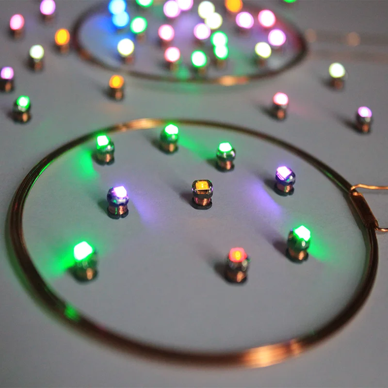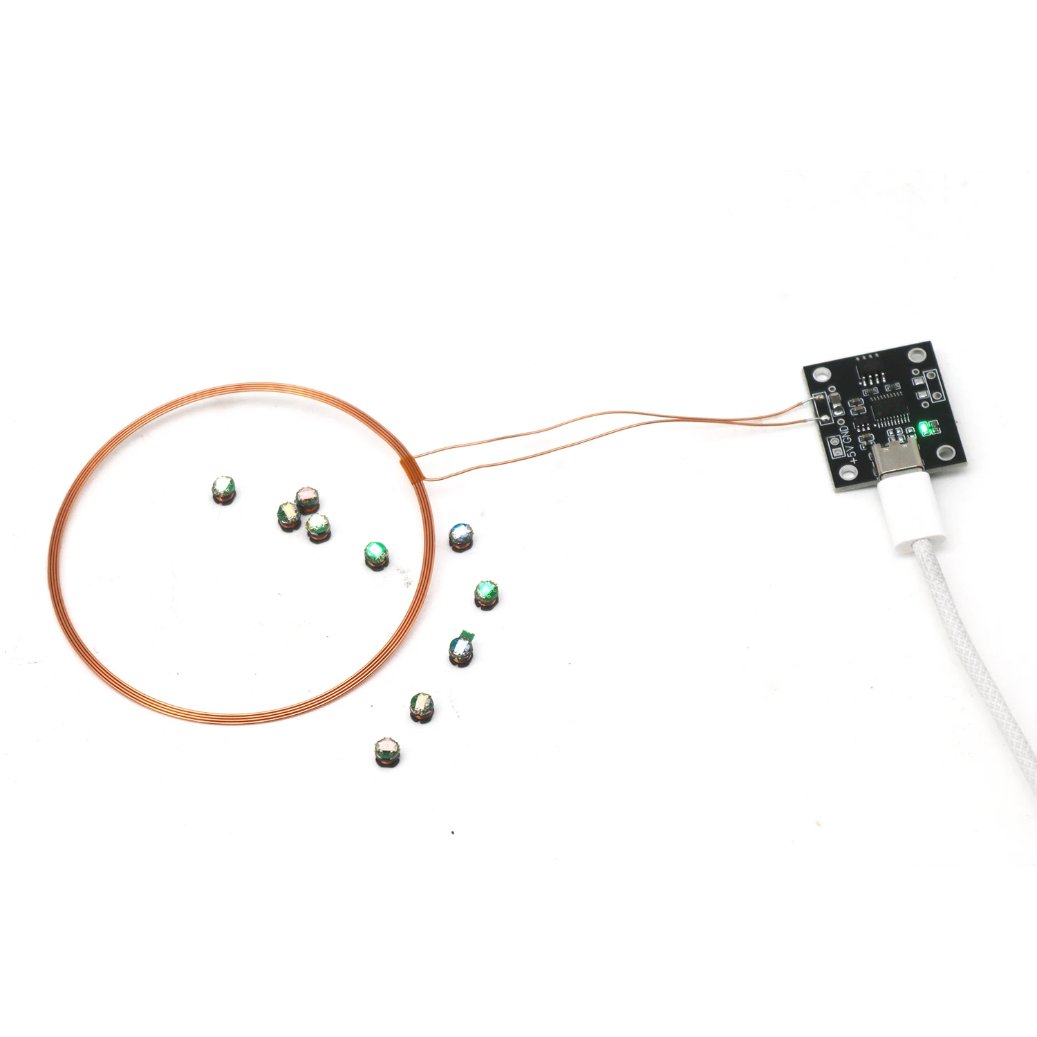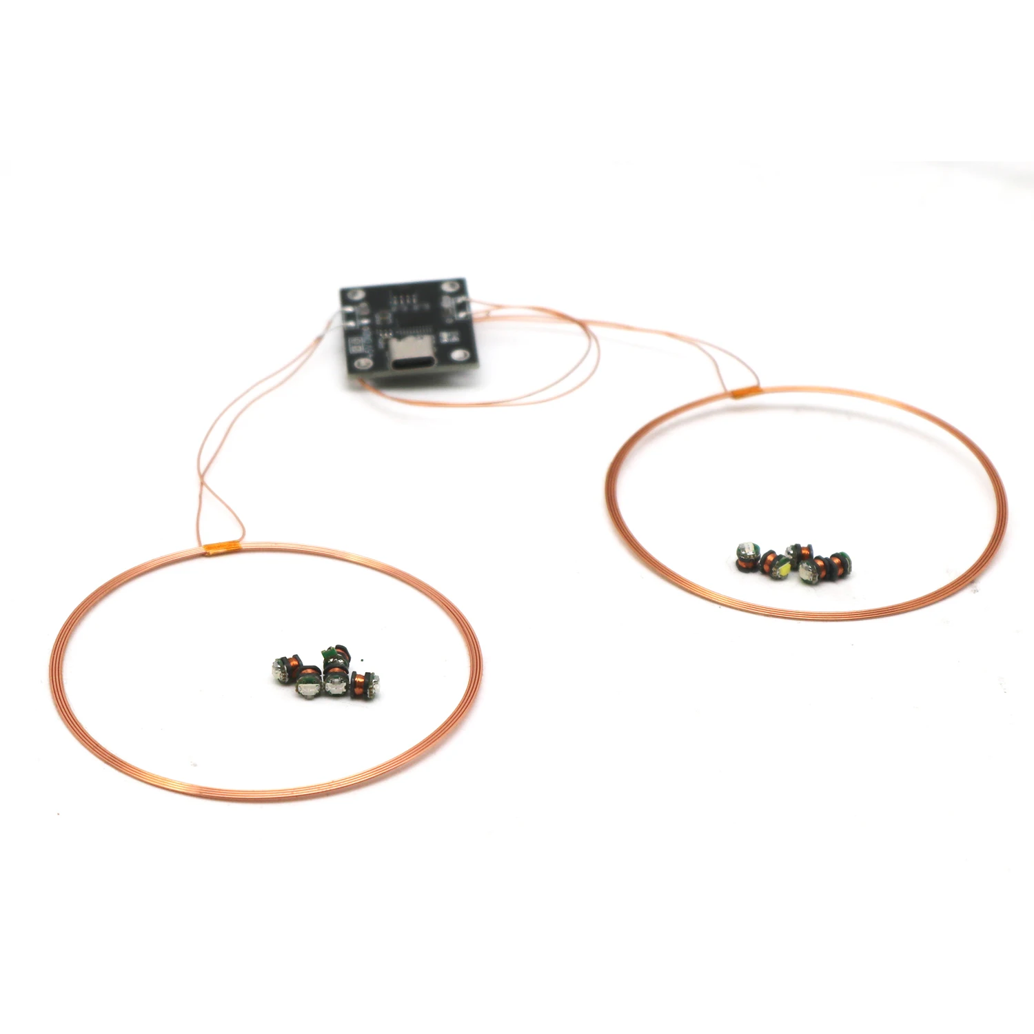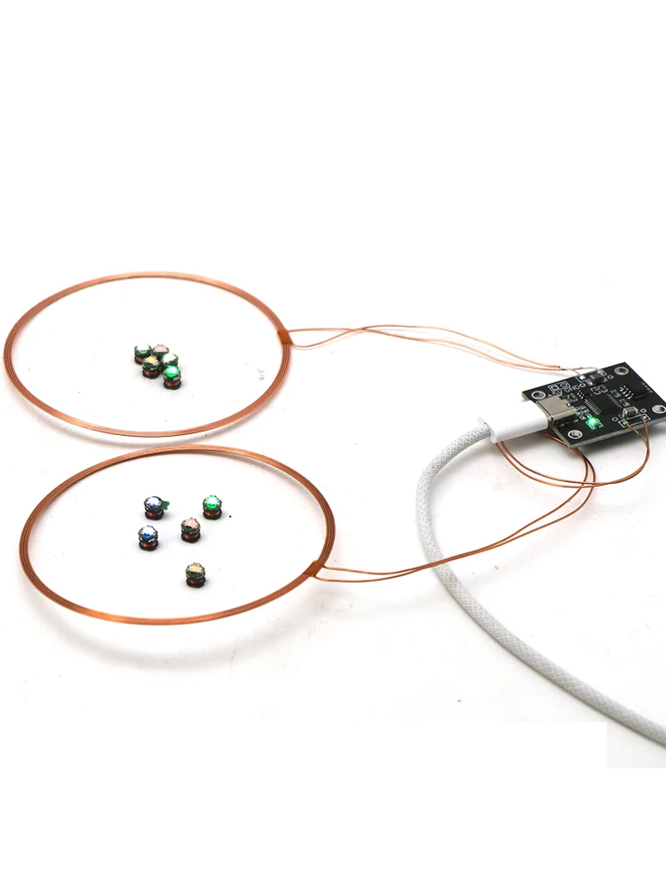 Experience seamless wireless illumination with this compact, sleek system designed to enhance your DIY projects, models, or creative displays. Featuring a small rectangular black circuit board with rounded edges, it is accented by metallic contact points and a discreet white USB Type-C port for easy connection. The tiny green LED indicator softly glows when powered, confirming activation. Attached are two delicate copper induction coils—one large, approximately 7cm in diameter, and a smaller counterpart—both radiating warm, reddish-bronze hues. Embedded within each coil are multicolored miniature LED bulbs in vibrant reds, blues, greens, whites, and yellows that create a lively, colorful display when energized. Its minimalistic yet playful aesthetic makes it ideal for customized lighting solutions and artistic experimentation.