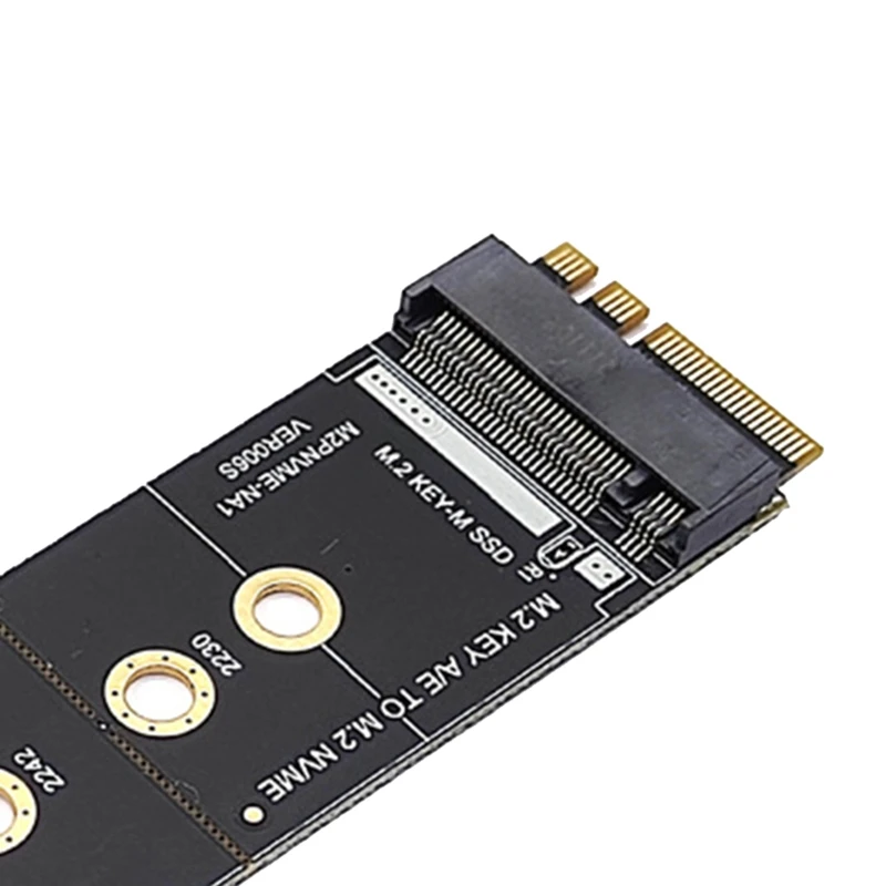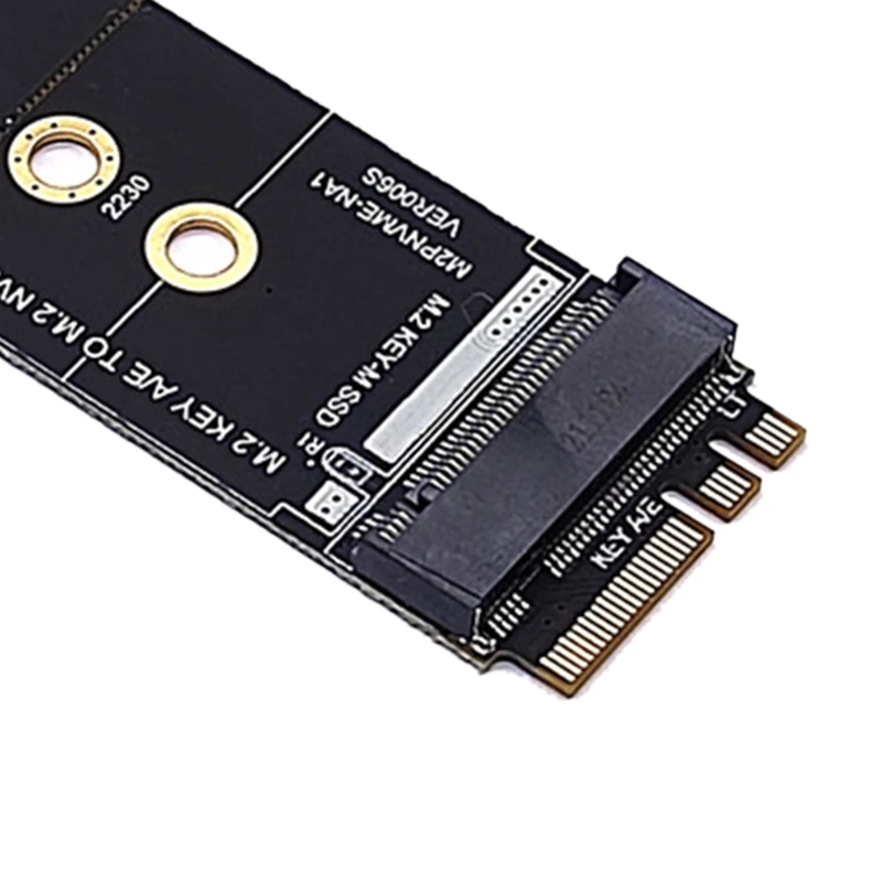 Experience seamless integration with this high-quality wireless M.2 adapter designed to convert M.2 A/E Key interfaces to M.2 M Key NVMe. Its slim, black rectangular chassis, measuring approximately 91.8mm in length and 22.4mm in width, offers a modern industrial aesthetic accentuated by refined gold-colored mounting holes. The gold-plated edge connector ensures reliable PCIe connection, while the white silkscreen markings increase readability and usability. The four available mounting holes accommodate SSD sizes 2230, 2242, 2260, and 2280, making installation flexible across various systems. Its minimalistic and functional design will blend effortlessly into your setup, providing a reliable, driver-free, and power-efficient method to expand storage or upgrade your device.
