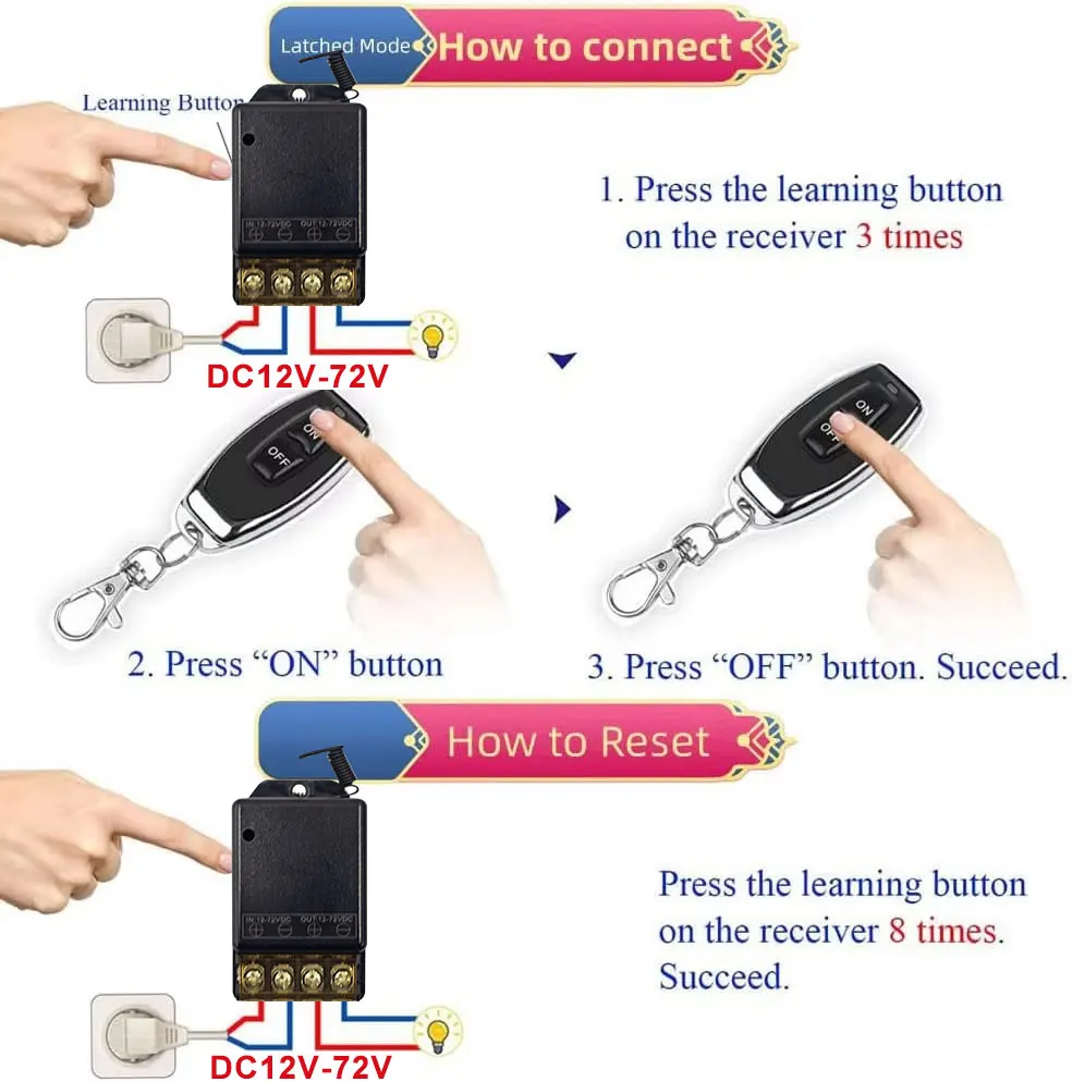- Supports multiple modes—momentary, toggle, and latched—for versatile operation, with easy setup via eight presses of the learning button for reset and configuration.